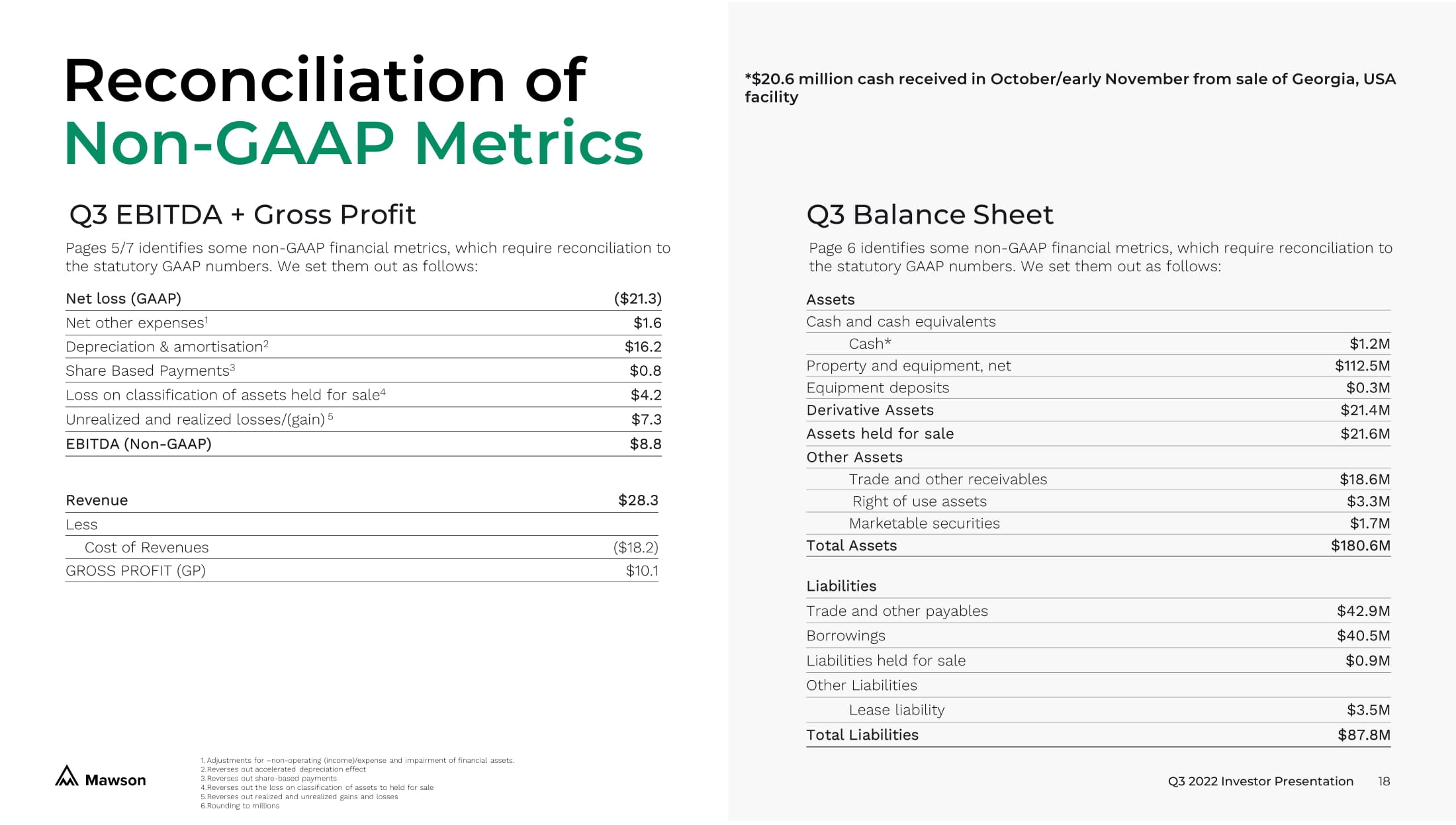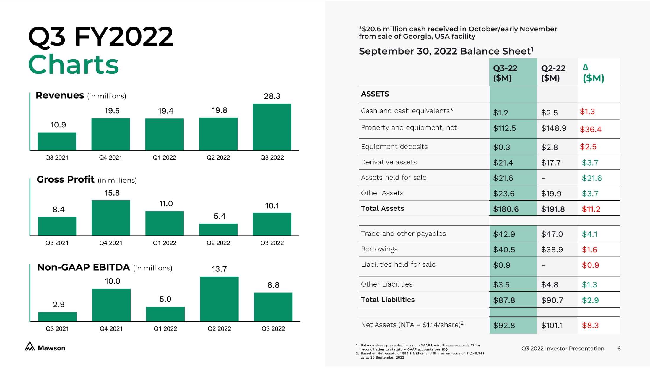 Q3 2022 Investor Presentation 6 Q3 - 22 ($M) Q2 - 22 ($M) Δ ($M) ASSETS Cash and cash equivalents $1.2 $2.5 $1.3 Property and equipment, net $112.5 $148.9 $36.4 Equipment deposits $0.3 $2.8 $2.5 Derivative assets $21.4 $17.7 $3.7 Assets held for sale $21.6 - $21.6 Other Assets $23.6 $19.9 $3.7 Total Assets $180.6 $191.8 $11.2 Trade and other payables $42.9 $47.0 $4.1 Borrowings $40.5 $38.9 $1.6 Liabilities held for sale $0.9 - $0.9 Other Liabilities $3.5 $4.8 $1.3 Total Liabilities $87.8 $90.7 $2.9 Net Assets (NTA = $1.14/share) 2 $92.8 $101.1 $8.3 *$20.6 million cash received in October/early November from sale of Georgia, USA facility Q3 FY2022 Charts 1. Balance sheet presented in a non - GAAP basis. Please see page 17 for reconciliation to statutory GAAP accounts per 10Q. 2. Based on Net Assets of $92.8 Million and Shares on issue of 81,249,768 as at 30 September 2022 September 30, 2022 Balance Sheet 1 10.9 19.5 19.4 19.8 28.3 Q3 2021 Q4 2021 Q1 2022 Q2 2022 Q3 2022 Revenues (in millions) 8.4 15.8 11.0 5.4 10.1 Q3 2021 Q4 2021 Q1 2022 Q2 2022 Q3 2022 Gross Profit (in millions) 2.9 10.0 5 13.7 8.8 Q3 2021 Q4 2021 Q1 2022 Q2 2022 Q3 2022 Non - GAAP EBITDA (in millions)