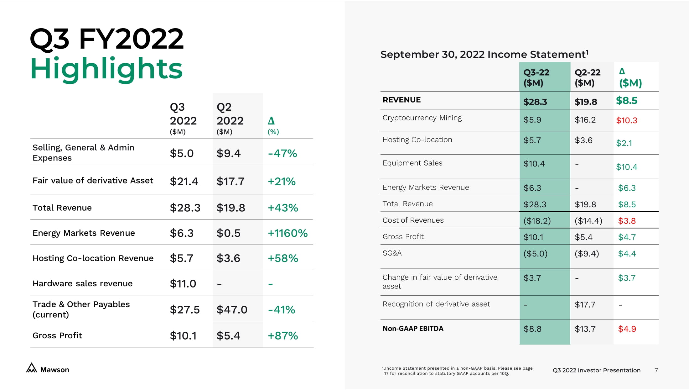 Q3 2022 Investor Presentation 7 Q3 - 22 ($M) Q2 - 22 ($M) Δ ($M) REVENUE $28.3 $19.8 $8.5 Cryptocurrency Mining $5.9 $16.2 $10.3 Hosting Co - location $5.7 $3.6 $2.1 Equipment Sales $10.4 - $10.4 Energy Markets Revenue $6.3 - $6.3 Total Revenue $28.3 $19.8 $8.5 Cost of Revenues ($18.2) ($14.4) $3.8 Gross Profit $10.1 $5.4 $4.7 SG&A ($5.0) ($9.4) $4.4 Change in fair value of derivative asset $3.7 - $3.7 Recognition of derivative asset - $17.7 - Non - GAAP EBITDA $8.8 $13.7 $4.9 Q3 FY2022 Highlights 1. Income Statement presented in a non - GAAP basis. Please see page 17 for reconciliation to statutory GAAP accounts per 10Q. September 30, 2022 Income Statement 1 Q3 2022 ($M) Q2 2022 ($M) Δ (%) Selling, General & Admin Expenses $5.0 $9.4 - 47% Fair value of derivative Asset $21.4 $17.7 +21% Total Revenue $28.3 $19.8 +43% Energy Markets Revenue $6.2 $0.5 +1140% Hosting Co - location Revenue $5.7 $3.6 +58% Hardware sales revenue $11.0 - - Trade & Other Payables (current) $27.5 $47.0 - 41% Gross Profit $10.1 $5.4 +87%