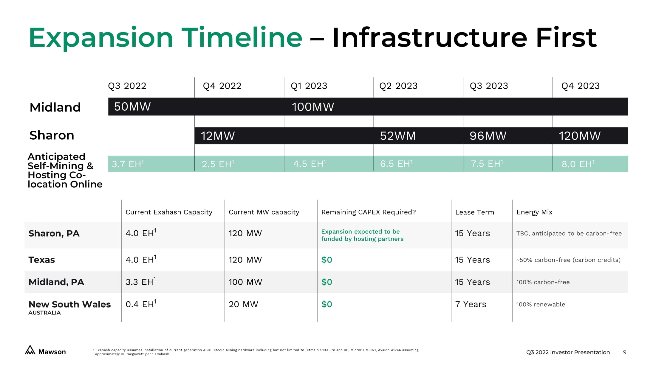 Q3 2022 Investor Presentation 9 1. Exahash capacity assumes installation of current generation ASIC Bitcoin Mining hardware including but not limited to Bitmain S19J Pro and XP, MicroBT M30/1, Avalon A1246 assuming approximately 30 megawatt per 1 Exahash . Midland Sharon 50MW 100MW 12MW 120MW 3.7 EH 1 Anticipated Self - Mining & Hosting Co - location Online Q4 2022 Q1 2023 Q2 2023 Q3 2023 52WM 2.5 EH 1 4.5 EH 1 6.5 EH 1 96MW 7.5 EH 1 Q3 2022 Q4 2023 Current Exahash Capacity Current MW capacity Remaining CAPEX Required? Lease Term Energy Mix Sharon, PA 4.0 EH 1 120 MW Expansion expected to be funded by hosting partners 15 Years TBC, anticipated to be carbon - free Texas 4.0 EH 1 120 MW $0 15 Years ~50% carbon - free (carbon credits) Midland, PA 3.3 EH 1 100 MW $0 15 Years 100% carbon - free New South Wales AUSTRALIA 0.4 EH 1 20 MW $0 7 Years 100% renewable Expansion Timeline – Infrastructure First 8.0 EH 1