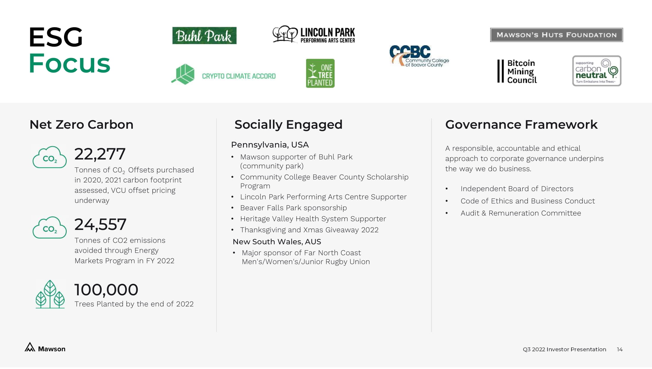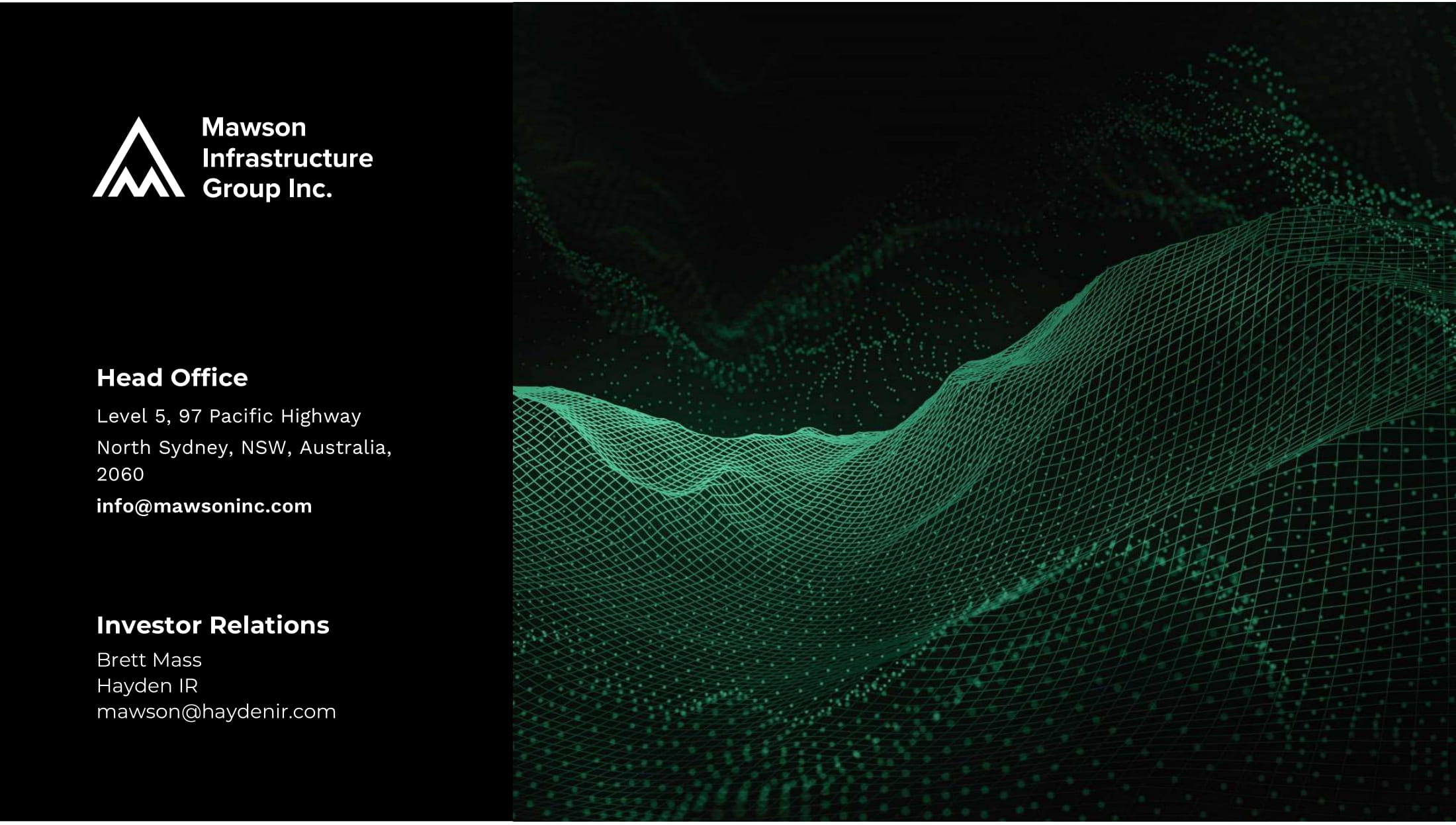 Q3 2022 Investor Presentation Level 5, 97 Pacific Highway North Sydney, NSW, Australia, 2060 info@mawsoninc.com Brett Mass Hayden IR mawson@haydenir.com Investor Relations Head Office