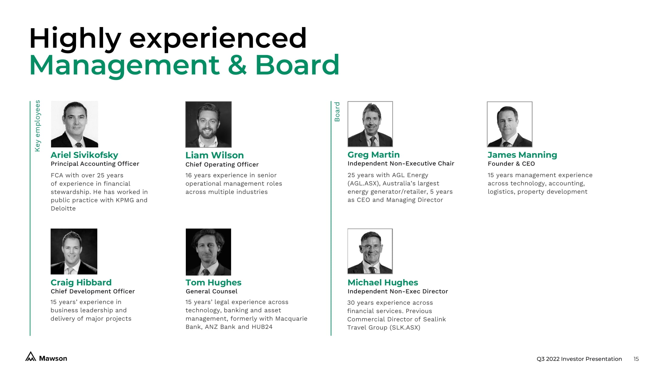 Q3 2022 Investor Presentation 14 ESG Focus 100,000 22,277 Tonnes of C0 2 Offsets purchased in 2020, 2021 carbon footprint assessed, VCU offset pricing underway Pennsylvania, USA • Mawson supporter of Buhl Park (community park) • Community College Beaver County Scholarship Program • Lincoln Park Performing Arts Centre Supporter • Beaver Falls Park sponsorship • Heritage Valley Health System Supporter • Thanksgiving and Xmas Giveaway 2022 A responsible, accountable and ethical approach to corporate governance underpins the way we do business. • Independent Board of Directors • Code of Ethics and Business Conduct • Audit & Remuneration Committee Net Zero Carbon Socially Engaged Governance Framework Trees Planted by the end of 2022 New South Wales, AUS • Major sponsor of Far North Coast Men's/Women's/Junior Rugby Union 24,557 Tonnes of CO2 emissions avoided through Energy Markets Program in FY 2022