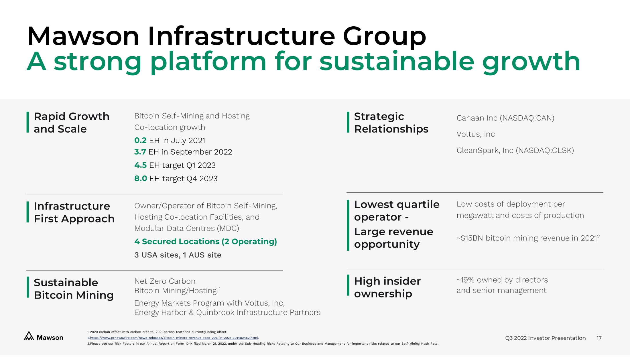 Q3 2022 Investor Presentation 16 Ticker NASDAQ:MIGI Share price $0.41 S hares outstanding 81,249,768 1 $33M Market capitalization Mawson Register 76% 24% Based on share price as at 8 November, 2022 Board and Management 19% External Investors 81% High Insider ownership 1. As at September 30, 2022