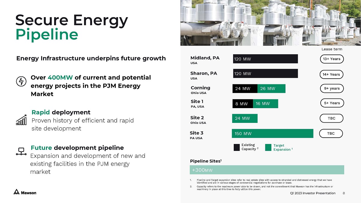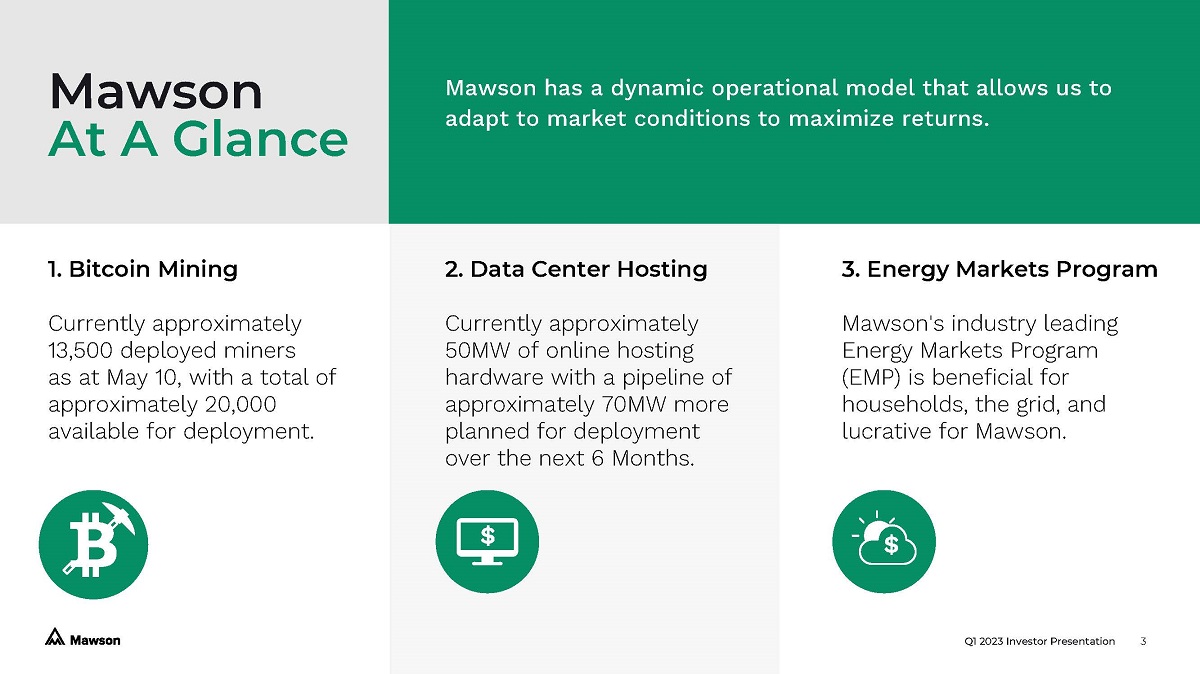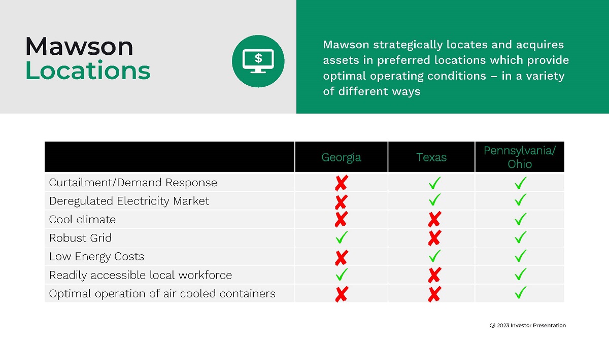 Q1 2023 Investor Presentation Mawson strategically locates and acquires assets in preferred locations which provide optimal operating conditions – in a variety of different ways Mawson Locations Georgia Texas Pennsylvania/ Ohio Curtailment/Demand Response Deregulated Electricity Market Cool climate Robust Grid Low Energy Costs Readily accessible local workforce Optimal operation of air cooled containers