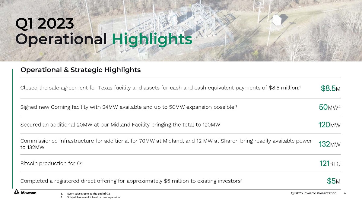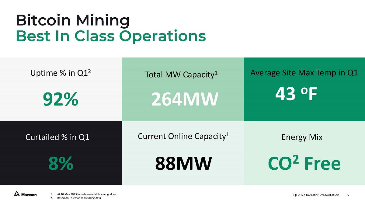 Q1 2023 Investor Presentation 4 Q1 2023 Operational Highlights Operational & Strategic Highlights Closed the sale agreement for Texas facility and assets for cash and cash equivalent payments of $8.5 million. 1 $8.5 M Signed new Corning facility with 24MW available and up to 50MW expansion possible. 1 50 MW 2 Secured an additional 20MW at our Midland Facility bringing the total to 120MW 120 MW Commissioned infrastructure for additional for 70MW at Midland, and 12 MW at Sharon bring readily available power to 132MW 132 MW Bitcoin production for Q1 121 BTC Completed a registered direct offering for approximately $5 million to existing investors 1 $5 M 1. Event subsequent to the end of Q1 2. Subject to current infrastructure expansion