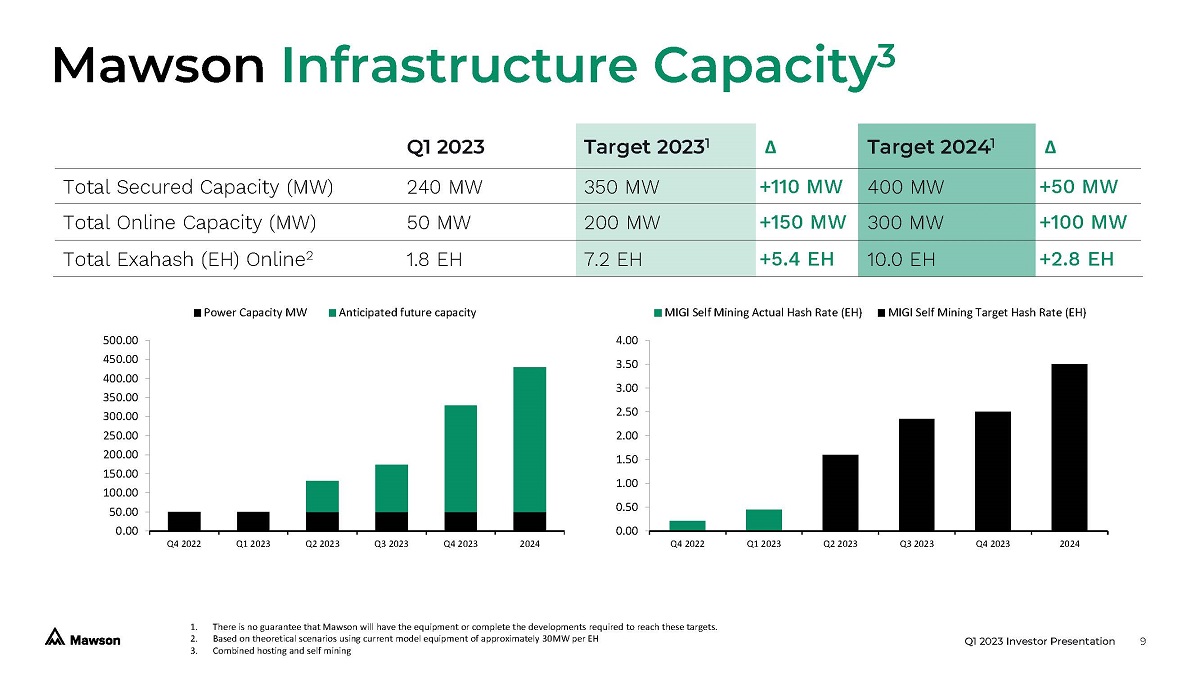 8 Midland, PA USA Secure Energy Pipeline Pipeline Sites 1 +300 MW 13+ Years Lease term 1. 2. Pipeline and Target expansion sites refer to real estate sites with access to stranded and distressed energy that we have identified and are in various stages of commercial negotiations for purchase or lease. Capacity refers to the maximum power able to be drawn, and not the commitment that Mawson has the infrastructure or machinery in place at this time to fully utilize this power. Q1 2023 Investor Presentation Sharon, PA USA 14+ Years Existing Capacity 2 Target Expansion 1 120 MW Site 3 PA USA TBC 150 MW Corning Ohio USA 9+ years 24 MW 8 MW Site 1 PA, USA 5+ Years Energy Infrastructure underpins future growth Over 400MW of current and potential energy projects in the PJM Energy Market Rapid deployment Proven history of efficient and rapid site development Future development pipeline Expansion and development of new and existing facilities in the PJM energy market 120 MW Site 2 Ohio USA TBC 24 MW 16 MW 26 MW