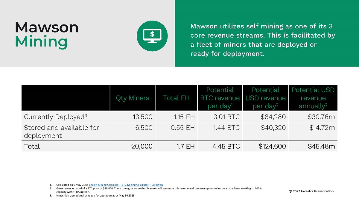 Q1 2023 Investor Presentation Mawson utilizes self mining as one of its 3 core revenue streams. This is facilitated by a fleet of miners that are deployed or ready for deployment. Mawson Mining Qty Miners Total EH Potential BTC revenue per day 1 Potential USD revenue per day 2 Potential USD revenue annually 2 Currently Deployed 3 13,500 1.15 EH 3.01 BTC $84,280 $30.76m Stored and available for deployment 6,500 0.55 EH 1.44 BTC $40,320 $14.72m Total 20,000 1.7 EH 4.45 BTC $124,600 $45.48m 1. Calculated on 9 May using Bitcoin Mining Calculator - BTC Mining Calculator – CoinWarz 2. Gross revenue based of a BTC price of $28,000. There is no guarantee that Mawson will generate this income and the assumption relies on all machines working to 100% capacity with 100% uptime. 3. In position operational or ready for operation as at May 10 2023