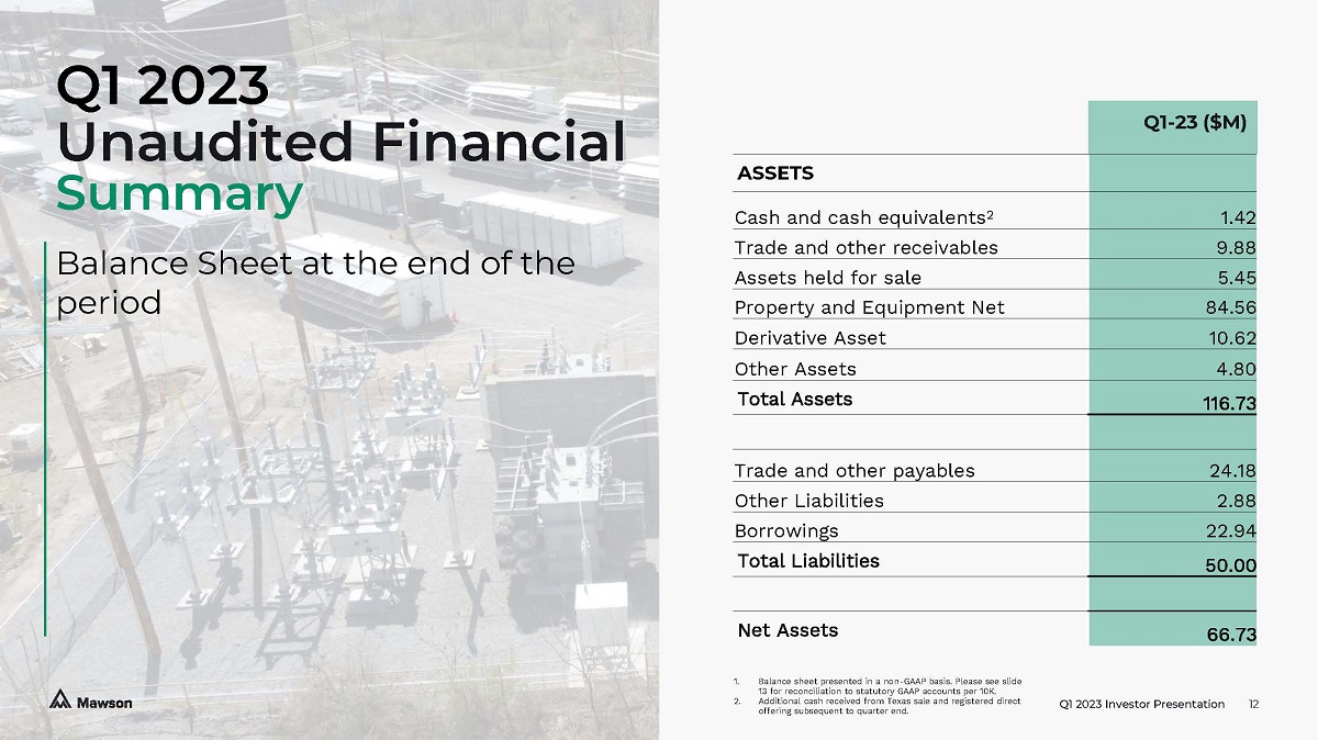 Q1 2023 Investor Presentation 11 Q1 - 23 ($M) Revenue - Mining 2.76 - Hosting 4.32 - Energy 0.44 - Sale of Assets 1.59 Expenses - Cost of Revenues (4.68) - Selling General and Administrative (4.98) - Change in Valuation of Assets (0.68) - Share Based Payments (1.07) - Other 0.26 EBITDA (2.04) Adjusted EBITDA (0.44) Depreciation (7.96) Interest (0.84) Tax (0.55) Profit/(Loss) (11.38) Q1 2023 Unaudited Financial Summary Income Statement for the period