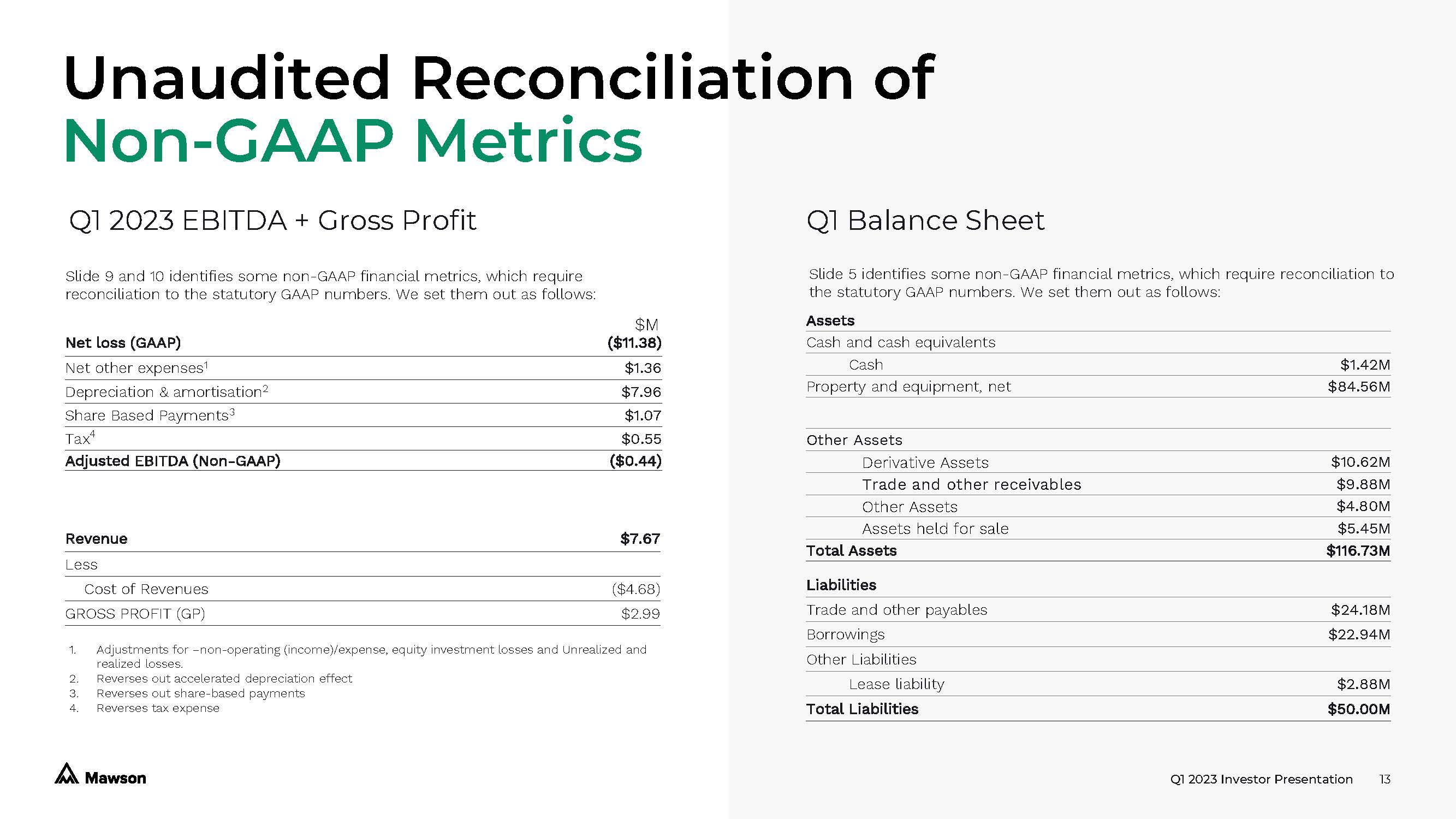 Q1 2023 Investor Presentation 13 Unaudited Reconciliation of Q1 Balance Sheet Net loss (GAAP) ($11.38) Net other expenses 1 $1.36 Depreciation & amortisation 2 $7.96 Share Based Payments 3 $1.07 Tax 4 $0.55 Adjusted EBITDA (Non - GAAP) ($0.44) 1. Adjustments for – non - operating (income)/expense, equity investment losses and Unrealized and realized losses. 2. Reverses out accelerated depreciation effect 3. Reverses out share - based payments 4. Reverses tax expense Non - GAAP Metrics Q1 2023 EBITDA + Gross Profit Slide 9 and 10 identifies some non - GAAP financial metrics, which require reconciliation to the statutory GAAP numbers. We set them out as follows: Slide 5 identifies some non - GAAP financial metrics, which require reconciliation to the statutory GAAP numbers. We set them out as follows: Revenue $7.67 Less Cost of Revenues ($4.68) GROSS PROFIT (GP) $2.99 Assets Cash and cash equivalents Cash $1.42M Property and equipment, net $84.56M Other Assets Derivative Assets $10.62M Trade and other receivables $9.88M Other Assets $4.80M Assets held for sale $5.45M Total Assets $116.73M Liabilities Trade and other payables $24.18M Borrowings $22.94M Other Liabilities Lease liability $2.88M Total Liabilities $50.00M $M