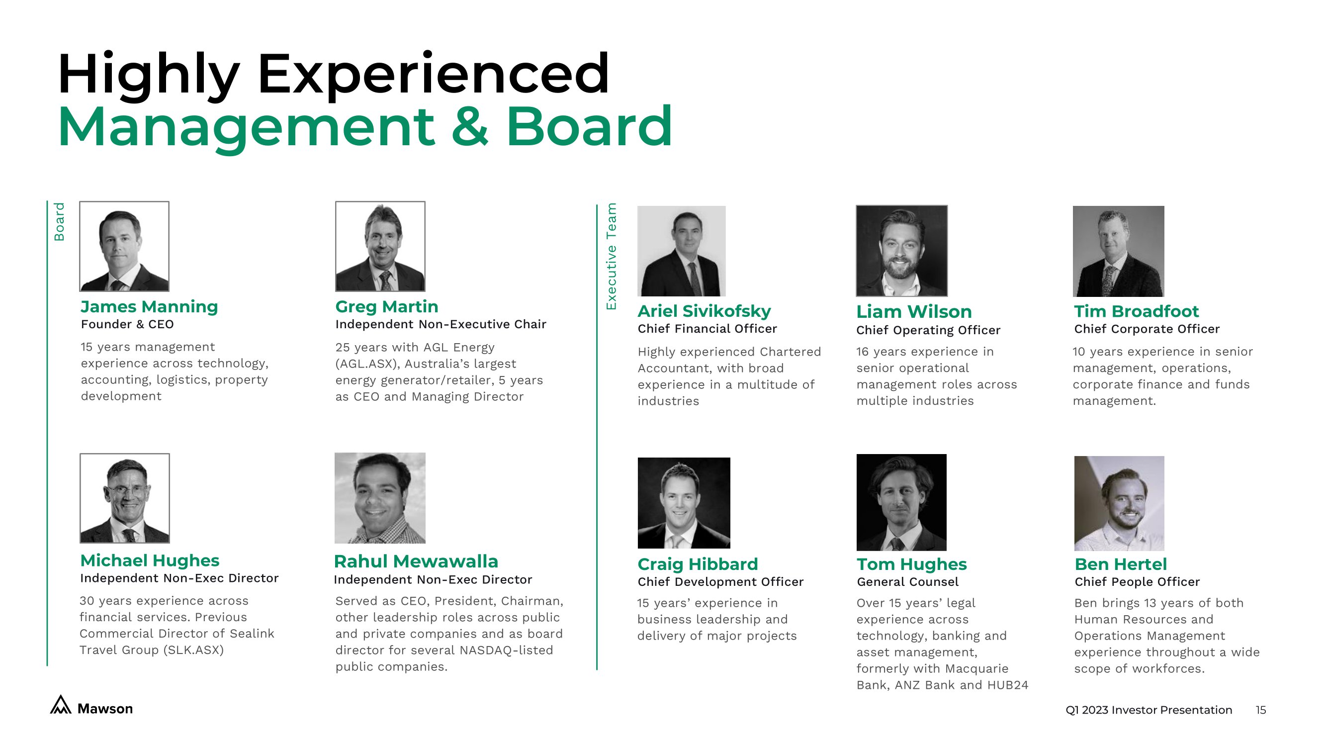 Q1 2023 Investor Presentation 14 ESG Focus 100,000 Carbon free 1 Pennsylvania, USA • Mawson supporter of Buhl Park (community park) • Community College Beaver County Scholarship Program • Lincoln Park Performing Arts Centre Supporter • Library Park, Beaver Falls sponsorship • Heritage Valley Health System Supporter • Independent Board of Directors • Code of Ethics and Business Conduct • Audit & Compensation Committee Net Zero Carbon Nuclear Power – Socially Engaged Governance Framework A responsible, accountable and ethical approach to corporate governance underpins the way we do business. Trees Planted to date 4,134 2 Tonnes of CO2 emissions avoided through Energy Demand Response Programs in Q1 All energy used in hosting and self mining is carbon free 1. 2. Only relates to direct power usage for mining operations. Data calculated by Voltus inc. for the period. Ohio, USA • Member of Ohio Manufacturers Association (OMA)