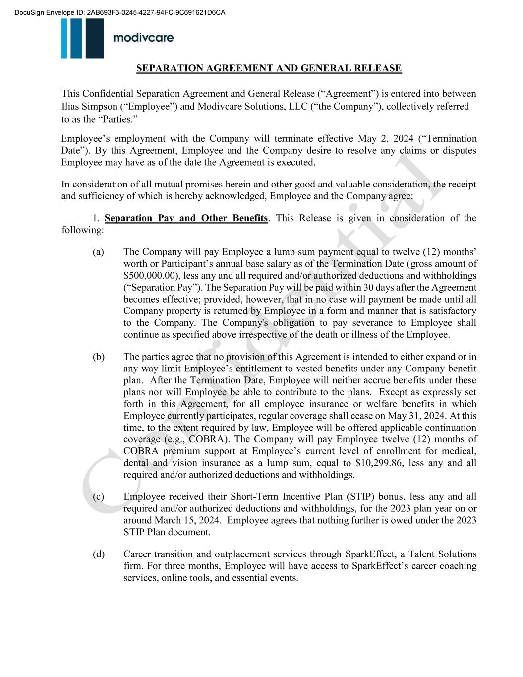 SEPARATION AGREEMENT AND GENERAL RELEASE Ilias Simpson c terminate effective May 2, 2024 . By this Agreement, Employee and the Company desire to resolve any claims or disputes Employee may have as of the date the Agreement is executed. In consideration of all mutual promises herein and other good and valuable consideration, the receipt and sufficiency of which is hereby acknowledged, Employee and the Company agree: 1. Separation Pay and Other Benefits. This Release is given in consideration of the following: (a) The Company will pay Employee a lump sum payment equal to twelve (12) gross amount of $500,000.00), less any and all required and/or authorized deductions and withholdings . The Separation Pay will be paid within 30 days after the Agreement becomes effective; provided, however, that in no case will payment be made until all Company property is returned by Employee in a form and manner that is satisfactory to the Company. The Company's obligation to pay severance to Employee shall continue as specified above irrespective of the death or illness of the Employee. (b) The parties agree that no provision of this Agreement is intended to either expand or in plan. After the Termination Date, Employee will neither accrue benefits under these plans nor will Employee be able to contribute to the plans. Except as expressly set forth in this Agreement, for all employee insurance or welfare benefits in which Employee currently participates, regular coverage shall cease on May 31, 2024. At this time, to the extent required by law, Employee will be offered applicable continuation coverage (e.g., COBRA). The Company will pay Employee twelve (12) months of COBRA premium support at current level of enrollment for medical, dental and vision insurance as a lump sum, equal to $10,299.86, less any and all required and/or authorized deductions and withholdings. (c) Employee received their Short-Term Incentive Plan (STIP) bonus, less any and all required and/or authorized deductions and withholdings, for the 2023 plan year on or around March 15, 2024. Employee agrees that nothing further is owed under the 2023 STIP Plan document. (d) Career transition and outplacement services through SparkEffect, a Talent Solutions firm. For three months, Employee will have access to SparkEffect services, online tools, and essential events.