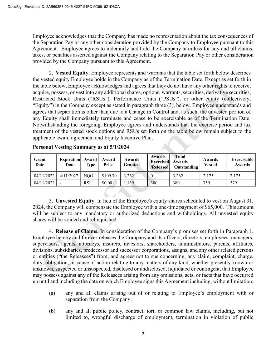 2 Employee acknowledges that the Company has made no representation about the tax consequences of the Separation Pay or any other consideration provided by the Company to Employee pursuant to this Agreement. Employee agrees to indemnify and hold the Company harmless for any and all claims, taxes, or penalties asserted against the Company relating to the Separation Pay or other consideration provided by the Company pursuant to this Agreement. 2. Vested Equity. Employee represents and warrants that the table set forth below describes the vested equity Employee holds in the Company as of the Termination Date. Except as set forth in the table below, Employee acknowledges and agrees that they do not have any other rights to receive, acquire, possess, or vest into any additional shares, options, warrants, securities, derivative securities, Restricted Stock Units Performance except as stated in paragraph three (3), below. Employee understands and agrees that separation is other than due to a Change in Control and, as such, the unvested portion of any Equity shall immediately terminate and cease to be exercisable as of the Termination Date. Notwithstanding the foregoing, Employee agrees and understands that the exercise period and tax treatment of the vested stock options and RSUs set forth on the table below remain subject to the applicable award agreement and Equity Incentive Plan. Personal Vesting Summary as at 5/1/2024 3. Unvested Equity. In lieu of the Employee's equity shares scheduled to vest on August 31, 2024, the Company will compensate the Employee with a one-time payment of $65,000. This amount will be subject to any mandatory or authorized deductions and withholdings. All unvested equity shares will be voided and relinquished. 4. Release of Claims. promises set forth in Paragraph 1, Employee hereby and forever releases the Company and its officers, directors, employees, managers, supervisors, agents, attorneys, insurers, investors, shareholders, administrators, parents, affiliates, divisions, subsidiaries, predecessor and successor corporations, assigns, and any other related persons g, any claim, complaint, charge, duty, obligation, or cause of action relating to any matters of any kind, whether presently known or unknown, suspected or unsuspected, disclosed or undisclosed, liquidated or contingent, that Employee may possess against any of the Releasees arising from any omissions, acts, or facts that have occurred up until and including the date on which Employee signs this Agreement including, without limitation: (a) with or separation from the Company; (b) any and all public policy, contract, tort, or common law claims, including, but not limited to, wrongful discharge of employment, termination in violation of public Grant Date Expiration Date Award Type Award Price Awards Granted Awards Exercised /Released Total Awards Outstanding Awards Vested Exercisable Awards 04/11/2022 4/11/2027 NQO $109.70 3,262 0 3,262 2,175 2,175 04/11/2022 - RSU $0.00 1,139 380 380 759 379