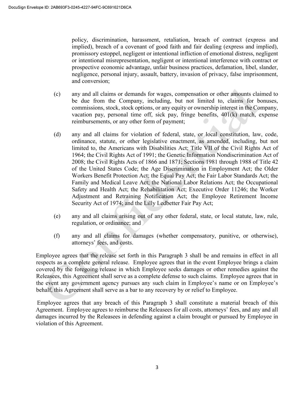 3 policy, discrimination, harassment, retaliation, breach of contract (express and implied), breach of a covenant of good faith and fair dealing (express and implied), promissory estoppel, negligent or intentional infliction of emotional distress, negligent or intentional misrepresentation, negligent or intentional interference with contract or prospective economic advantage, unfair business practices, defamation, libel, slander, negligence, personal injury, assault, battery, invasion of privacy, false imprisonment, and conversion; (c) any and all claims or demands for wages, compensation or other amounts claimed to be due from the Company, including, but not limited to, claims for bonuses, commissions, stock, stock options, or any equity or ownership interest in the Company, vacation pay, personal time off, sick pay, fringe benefits, 401(k) match, expense reimbursements, or any other form of payment; (d) any and all claims for violation of federal, state, or local constitution, law, code, ordinance, statute, or other legislative enactment, as amended, including, but not limited to, the Americans with Disabilities Act; Title VII of the Civil Rights Act of 1964; the Civil Rights Act of 1991; the Genetic Information Nondiscrimination Act of 2008; the Civil Rights Acts of 1866 and 1871; Sections 1981 through 1988 of Title 42 of the United States Code; the Age Discrimination in Employment Act; the Older Workers Benefit Protection Act; the Equal Pay Act; the Fair Labor Standards Act; the Family and Medical Leave Act; the National Labor Relations Act; the Occupational Safety and Health Act; the Rehabilitation Act; Executive Order 11246; the Worker Adjustment and Retraining Notification Act; the Employee Retirement Income Security Act of 1974; and the Lilly Ledbetter Fair Pay Act; (e) any and all claims arising out of any other federal, state, or local statute, law, rule, regulation, or ordinance; and (f) any and all claims for damages (whether compensatory, punitive, or otherwise), Employee agrees that the release set forth in this Paragraph 3 shall be and remains in effect in all respects as a complete general release. Employee agrees that in the event Employee brings a claim covered by the foregoing release in which Employee seeks damages or other remedies against the Releasees, this Agreement shall serve as a complete defense to such claims. Employee agrees that in behalf, this Agreement shall serve as a bar to any recovery by or relief to Employee. Employee agrees that any breach of this Paragraph 3 shall constitute a material breach of this damages incurred by the Releasees in defending against a claim brought or pursued by Employee in violation of this Agreement.