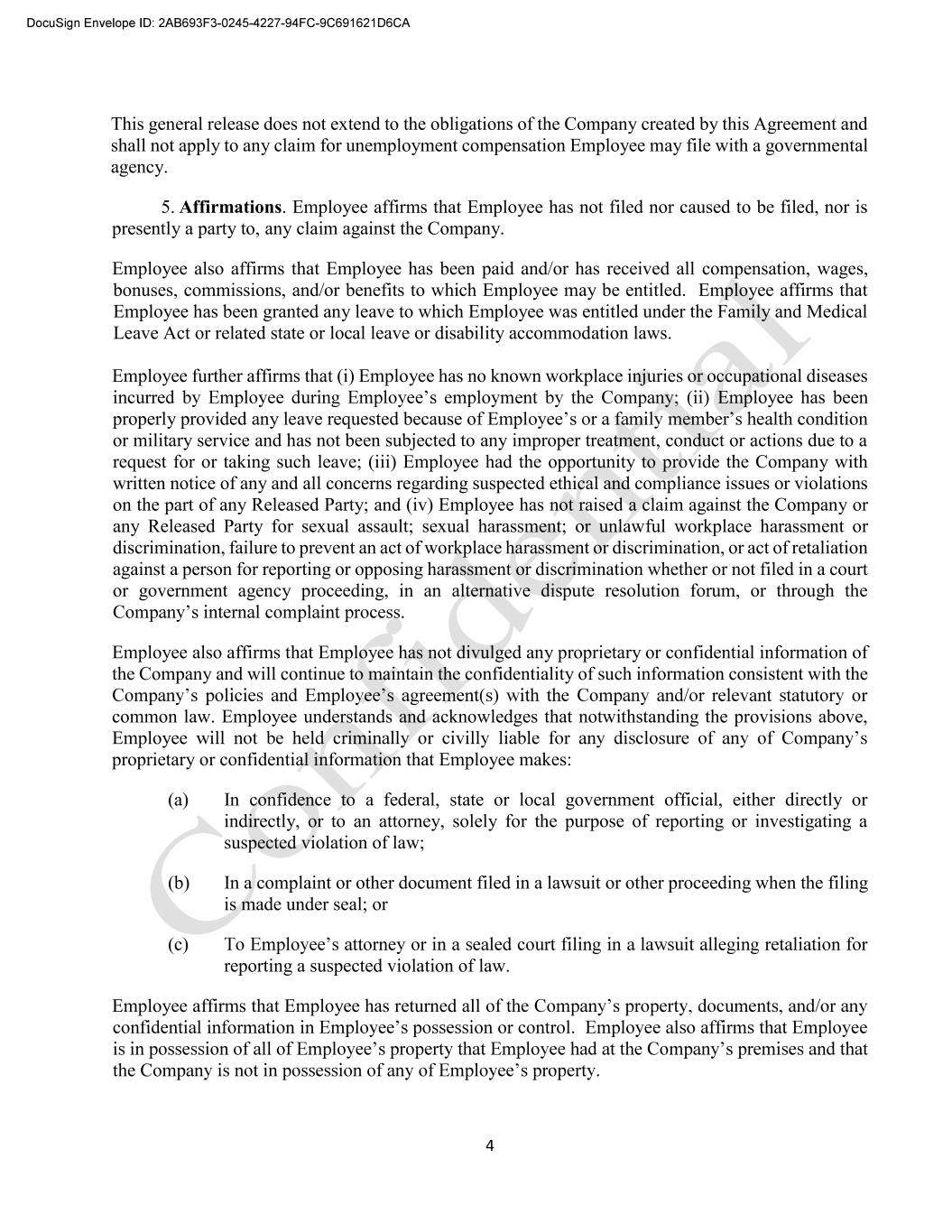 4 This general release does not extend to the obligations of the Company created by this Agreement and shall not apply to any claim for unemployment compensation Employee may file with a governmental agency. 5. Affirmations. Employee affirms that Employee has not filed nor caused to be filed, nor is presently a party to, any claim against the Company. Employee also affirms that Employee has been paid and/or has received all compensation, wages, bonuses, commissions, and/or benefits to which Employee may be entitled. Employee affirms that Employee has been granted any leave to which Employee was entitled under the Family and Medical Leave Act or related state or local leave or disability accommodation laws. Employee further affirms that (i) Employee has no known workplace injuries or occupational diseases Employee has been properly provided any leave requested because of Empl or military service and has not been subjected to any improper treatment, conduct or actions due to a request for or taking such leave; (iii) Employee had the opportunity to provide the Company with written notice of any and all concerns regarding suspected ethical and compliance issues or violations on the part of any Released Party; and (iv) Employee has not raised a claim against the Company or any Released Party for sexual assault; sexual harassment; or unlawful workplace harassment or discrimination, failure to prevent an act of workplace harassment or discrimination, or act of retaliation against a person for reporting or opposing harassment or discrimination whether or not filed in a court or government agency proceeding, in an alternative dispute resolution forum, or through the . Employee also affirms that Employee has not divulged any proprietary or confidential information of the Company and will continue to maintain the confidentiality of such information consistent with the common law. Employee understands and acknowledges that notwithstanding the provisions above, Employee proprietary or confidential information that Employee makes: (a) In confidence to a federal, state or local government official, either directly or indirectly, or to an attorney, solely for the purpose of reporting or investigating a suspected violation of law; (b) In a complaint or other document filed in a lawsuit or other proceeding when the filing is made under seal; or (c) reporting a suspected violation of law. Employee affirms that Employee has returned all the Comp