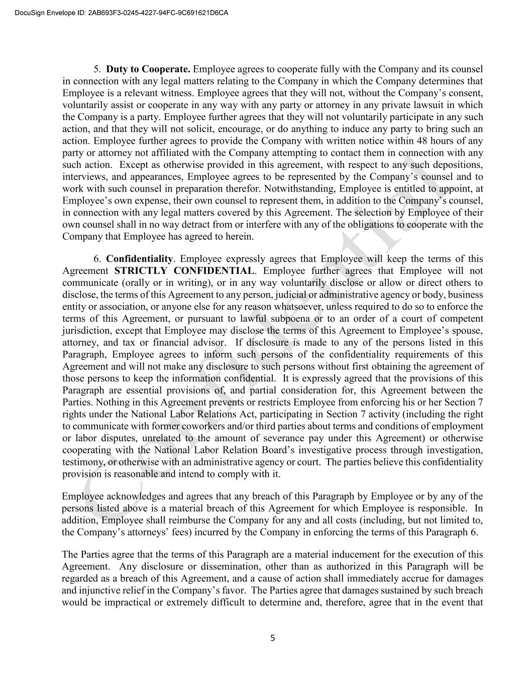 5 5. Duty to Cooperate. Employee agrees to cooperate fully with the Company and its counsel in connection with any legal matters relating to the Company in which the Company determines that Employee is a relevant witness. Employee agrees that they voluntarily assist or cooperate in any way with any party or attorney in any private lawsuit in which the Company is a party. Employee further agrees that they will not voluntarily participate in any such action, and that they will not solicit, encourage, or do anything to induce any party to bring such an action. Employee further agrees to provide the Company with written notice within 48 hours of any party or attorney not affiliated with the Company attempting to contact them in connection with any such action. Except as otherwise provided in this agreement, with respect to any such depositions, interviews, and appearances, Employee agrees to be represented by the Compan work with such counsel in preparation therefor. Notwithstanding, Employee is entitled to appoint, at own expense, their own counsel to represent them in connection with any legal matters covered by this Agreement. The selection by Employee of their own counsel shall in no way detract from or interfere with any of the obligations to cooperate with the Company that Employee has agreed to herein. 6. Confidentiality. Employee expressly agrees that Employee will keep the terms of this Agreement STRICTLY CONFIDENTIAL. Employee further agrees that Employee will not communicate (orally or in writing), or in any way voluntarily disclose or allow or direct others to disclose, the terms of this Agreement to any person, judicial or administrative agency or body, business entity or association, or anyone else for any reason whatsoever, unless required to do so to enforce the terms of this Agreement, or pursuant to lawful subpoena or to an order of a court of competent attorney, and tax or financial advisor. If disclosure is made to any of the persons listed in this Paragraph, Employee agrees to inform such persons of the confidentiality requirements of this Agreement and will not make any disclosure to such persons without first obtaining the agreement of those persons to keep the information confidential. It is expressly agreed that the provisions of this Paragraph are essential provisions of, and partial consideration for, this Agreement between the Parties. Nothing in this Agreement prevents or restricts Employee from enforcing his or her Section 7 rights under the National Labor Relations Act, participating in Section 7 activity (including the right to communicate with former coworkers and/or third parties about terms and conditions of employment or labor disputes, unrelated to the amount of severance pay under this Agreement) or otherwise testimony, or otherwise with an administrative agency or court. The parties believe this confidentiality provision is reasonable and intend to comply with it. Employee acknowledges and agrees that any breach of this Paragraph by Employee or by any of the persons listed above is a material breach of this Agreement for which Employee is responsible. In addition, Employee shall reimburse the Company for any and all costs (including, but not limited to, 6. The Parties agree that the terms of this Paragraph are a material inducement for the execution of this Agreement. Any disclosure or dissemination, other than as authorized in this Paragraph will be regarded as a breach of this Agreement, and a cause of action shall immediately accrue for damages and injunctive relief in favor. The Parties agree that damages sustained by such breach would be impractical or extremely difficult to determine and, therefore, agree that in the event that