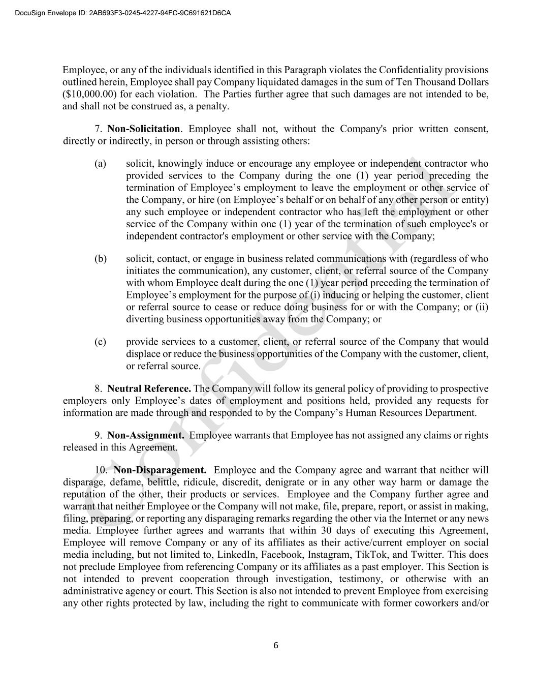 6 Employee, or any of the individuals identified in this Paragraph violates the Confidentiality provisions outlined herein, Employee shall pay Company liquidated damages in the sum of Ten Thousand Dollars ($10,000.00) for each violation. The Parties further agree that such damages are not intended to be, and shall not be construed as, a penalty. 7. Non-Solicitation. Employee shall not, without the Company's prior written consent, directly or indirectly, in person or through assisting others: (a) solicit, knowingly induce or encourage any employee or independent contractor who provided services to the Company during the one (1) year period preceding the lf or on behalf of any other person or entity) any such employee or independent contractor who has left the employment or other service of the Company within one (1) year of the termination of such employee's or independent contractor's employment or other service with the Company; (b) solicit, contact, or engage in business related communications with (regardless of who initiates the communication), any customer, client, or referral source of the Company with whom Employee dealt during the one (1) year period preceding the termination of or referral source to cease or reduce doing business for or with the Company; or (ii) diverting business opportunities away from the Company; or (c) provide services to a customer, client, or referral source of the Company that would displace or reduce the business opportunities of the Company with the customer, client, or referral source. 8. Neutral Reference. The Company will follow its general policy of providing to prospective 9. Non-Assignment. Employee warrants that Employee has not assigned any claims or rights released in this Agreement. 10. Non-Disparagement. Employee and the Company agree and warrant that neither will disparage, defame, belittle, ridicule, discredit, denigrate or in any other way harm or damage the reputation of the other, their products or services. Employee and the Company further agree and warrant that neither Employee or the Company will not make, file, prepare, report, or assist in making, filing, preparing, or reporting any disparaging remarks regarding the other via the Internet or any news media. Employee further agrees and warrants that within 30 days of executing this Agreement, Employee will remove Company or any of its affiliates as their active/current employer on social media including, but not limited to, LinkedIn, Facebook, Instagram, TikTok, and Twitter. This does not preclude Employee from referencing Company or its affiliates as a past employer. This Section is not intended to prevent cooperation through investigation, testimony, or otherwise with an administrative agency or court. This Section is also not intended to prevent Employee from exercising any other rights protected by law, including the right to communicate with former coworkers and/or