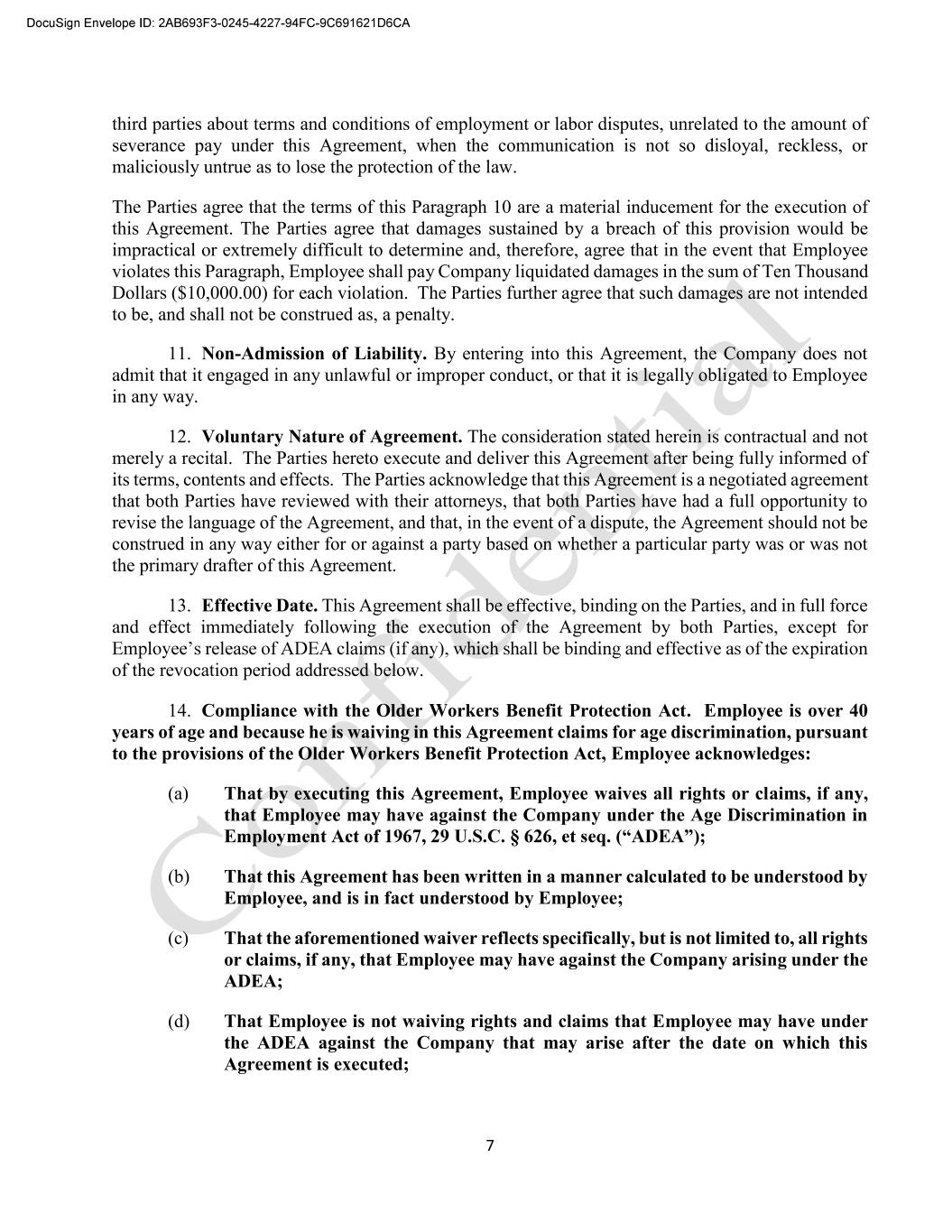 7 third parties about terms and conditions of employment or labor disputes, unrelated to the amount of severance pay under this Agreement, when the communication is not so disloyal, reckless, or maliciously untrue as to lose the protection of the law. The Parties agree that the terms of this Paragraph 10 are a material inducement for the execution of this Agreement. The Parties agree that damages sustained by a breach of this provision would be impractical or extremely difficult to determine and, therefore, agree that in the event that Employee violates this Paragraph, Employee shall pay Company liquidated damages in the sum of Ten Thousand Dollars ($10,000.00) for each violation. The Parties further agree that such damages are not intended to be, and shall not be construed as, a penalty. 11. Non-Admission of Liability. By entering into this Agreement, the Company does not admit that it engaged in any unlawful or improper conduct, or that it is legally obligated to Employee in any way. 12. Voluntary Nature of Agreement. The consideration stated herein is contractual and not merely a recital. The Parties hereto execute and deliver this Agreement after being fully informed of its terms, contents and effects. The Parties acknowledge that this Agreement is a negotiated agreement that both Parties have reviewed with their attorneys, that both Parties have had a full opportunity to revise the language of the Agreement, and that, in the event of a dispute, the Agreement should not be construed in any way either for or against a party based on whether a particular party was or was not the primary drafter of this Agreement. 13. Effective Date. This Agreement shall be effective, binding on the Parties, and in full force and effect immediately following the execution of the Agreement by both Parties, except for of the revocation period addressed below. 14. Compliance with the Older Workers Benefit Protection Act. Employee is over 40 years of age and because he is waiving in this Agreement claims for age discrimination, pursuant to the provisions of the Older Workers Benefit Protection Act, Employee acknowledges: (a) That by executing this Agreement, Employee waives all rights or claims, if any, that Employee may have against the Company under the Age Discrimination in (b) That this Agreement has been written in a manner calculated to be understood by Employee, and is in fact understood by Employee; (c) That the aforementioned waiver reflects specifically, but is not limited to, all rights or claims, if any, that Employee may have against the Company arising under the ADEA; (d) That Employee is not waiving rights and claims that Employee may have under the ADEA against the Company that may arise after the date on which this Agreement is executed;