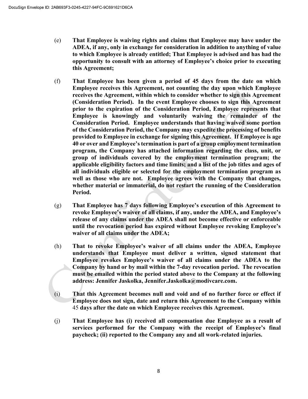 8 (e) That Employee is waiving rights and claims that Employee may have under the ADEA, if any, only in exchange for consideration in addition to anything of value to which Employee is already entitled; That Employee is advised and has had the this Agreement; (f) That Employee has been given a period of 45 days from the date on which Employee receives this Agreement, not counting the day upon which Employee receives the Agreement, within which to consider whether to sign this Agreement (Consideration Period). In the event Employee chooses to sign this Agreement prior to the expiration of the Consideration Period, Employee represents that Employee is knowingly and voluntarily waiving the remainder of the Consideration Period. Employee understands that having waived some portion of the Consideration Period, the Company may expedite the processing of benefits provided to Employee in exchange for signing this Agreement. If Employee is age group employment termination program, the Company has attached information regarding the class, unit, or group of individuals covered by the employment termination program; the applicable eligibility factors and time limits; and a list of the job titles and ages of all individuals eligible or selected for the employment termination program as well as those who are not. Employee agrees with the Company that changes, whether material or immaterial, do not restart the running of the Consideration Period. (g) revoke Emplo release of any claims under the ADEA shall not become effective or enforceable waiver of all claims under the ADEA; (h) understands that Employee must deliver a written, signed statement that Company by hand or by mail within the 7-day revocation period. The revocation must be emailed within the period stated above to the Company at the following address: Jennifer Jaskolka, Jennifer.Jaskolka@modivcare.com. (i) That this Agreement becomes null and void and of no further force or effect if Employee does not sign, date and return this Agreement to the Company within 45 days after the date on which Employee receives this Agreement. (j) That Employee has (i) received all compensation due Employee as a result of paycheck; (ii) reported to the Company any and all work-related injuries.