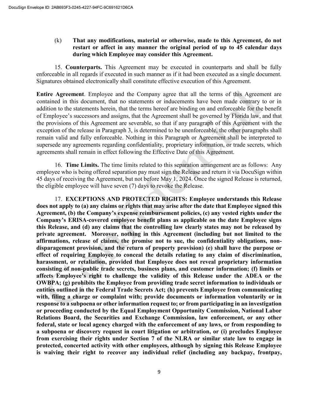 9 (k) That any modifications, material or otherwise, made to this Agreement, do not restart or affect in any manner the original period of up to 45 calendar days during which Employee may consider this Agreement. 15. Counterparts. This Agreement may be executed in counterparts and shall be fully enforceable in all regards if executed in such manner as if it had been executed as a single document. Signatures obtained electronically shall constitute effective execution of this Agreement. Entire Agreement. Employee and the Company agree that all the terms of this Agreement are contained in this document, that no statements or inducements have been made contrary to or in addition to the statements herein, that the terms hereof are binding on and enforceable for the benefit Florida law, and that the provisions of this Agreement are severable, so that if any paragraph of this Agreement with the exception of the release in Paragraph 3, is determined to be unenforceable, the other paragraphs shall remain valid and fully enforceable. Nothing in this Paragraph or Agreement shall be interpreted to supersede any agreements regarding confidentiality, proprietary information, or trade secrets, which agreements shall remain in effect following the Effective Date of this Agreement. 16. Time Limits. The time limits related to this separation arrangement are as follows: Any employee who is being offered separation pay must sign the Release and return it via DocuSign within 45 days of receiving the Agreement, but not before May 1, 2024. Once the signed Release is returned, the eligible employee will have seven (7) days to revoke the Release. 17. EXCEPTIONS AND PROTECTED RIGHTS: Employee understands this Release does not apply to (a) any claims or rights that may arise after the date that Employee signed this Agreement -covered employee benefit plans as applicable on the date Employee signs this Release, and (d) any claims that the controlling law clearly states may not be released by private agreement. Moreover, nothing in this Agreement (including but not limited to the affirmations, release of claims, the promise not to sue, the confidentiality obligations, non- disparagement provision, and the return of property provision) (e) shall have the purpose or effect of requiring Employee to conceal the details relating to any claim of discrimination, harassment, or retaliation, provided that Employee does not reveal proprietary information consisting of non-public trade secrets, business plans, and customer information; (f) limits or is Release under the ADEA or the OWBPA; (g) prohibits the Employee from providing trade secret information to individuals or entities outlined in the Federal Trade Secrets Act; (h) prevents Employee from communicating with, filing a charge or complaint with; provide documents or information voluntarily or in response to a subpoena or other information request to; or from participating in an investigation or proceeding conducted by the Equal Employment Opportunity Commission, National Labor Relations Board, the Securities and Exchange Commission, law enforcement, or any other federal, state or local agency charged with the enforcement of any laws, or from responding to a subpoena or discovery request in court litigation or arbitration, or (i) precludes Employee from exercising their rights under Section 7 of the NLRA or similar state law to engage in protected, concerted activity with other employees, although by signing this Release Employee is waiving their right to recover any individual relief (including any backpay, frontpay,
