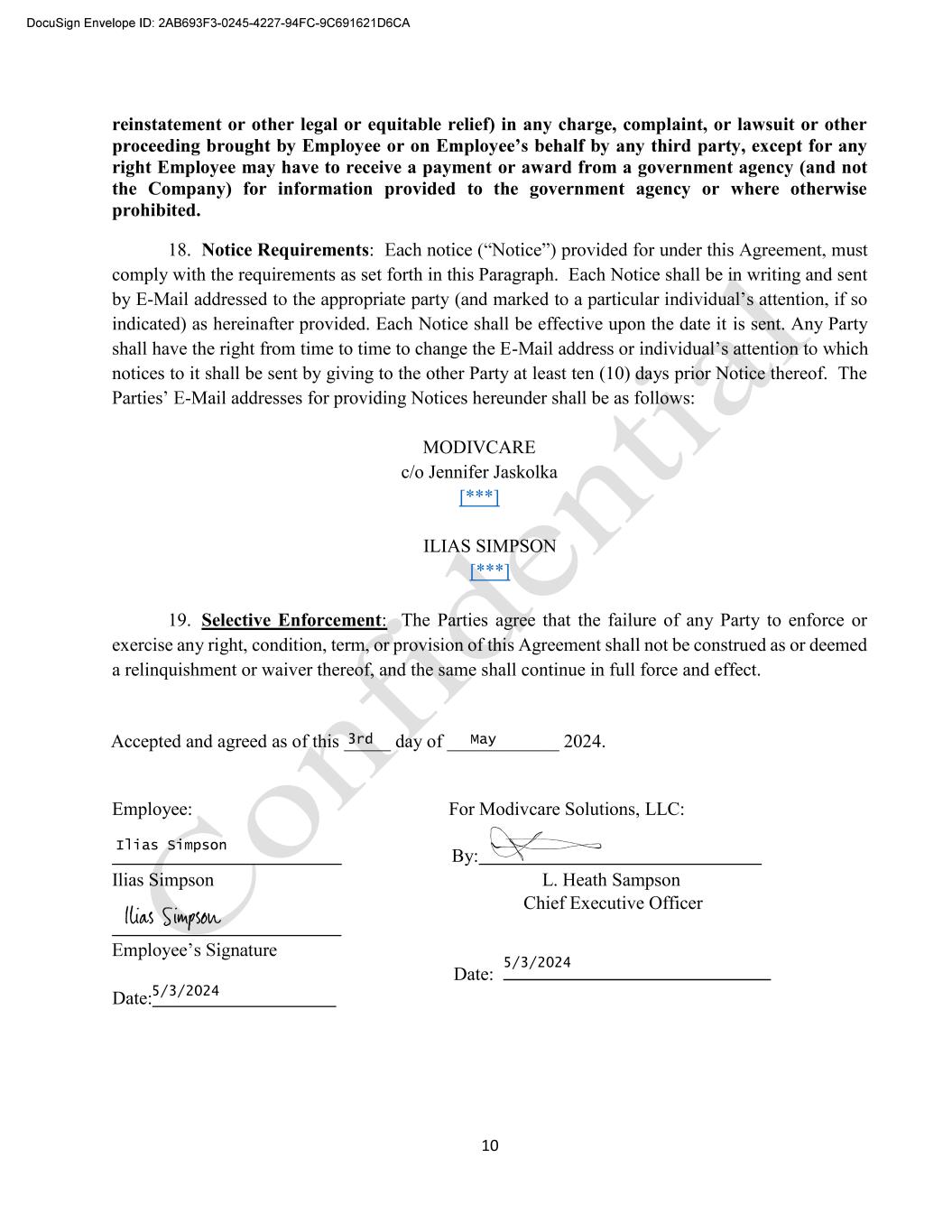 10 reinstatement or other legal or equitable relief) in any charge, complaint, or lawsuit or other right Employee may have to receive a payment or award from a government agency (and not the Company) for information provided to the government agency or where otherwise prohibited. 18. Notice Requirements: comply with the requirements as set forth in this Paragraph. Each Notice shall be in writing and sent by E- indicated) as hereinafter provided. Each Notice shall be effective upon the date it is sent. Any Party shall have the right from time to time to change the E- notices to it shall be sent by giving to the other Party at least ten (10) days prior Notice thereof. The -Mail addresses for providing Notices hereunder shall be as follows: MODIVCARE c/o Jennifer Jaskolka [***] ILIAS SIMPSON [***] 19. Selective Enforcement: The Parties agree that the failure of any Party to enforce or exercise any right, condition, term, or provision of this Agreement shall not be construed as or deemed a relinquishment or waiver thereof, and the same shall continue in full force and effect. Accepted and agreed as of this _____ day of ____________ 2024. Employee: For Modivcare Solutions, LLC: By: Ilias Simpson L. Heath Sampson Chief Executive Officer Date: Date: