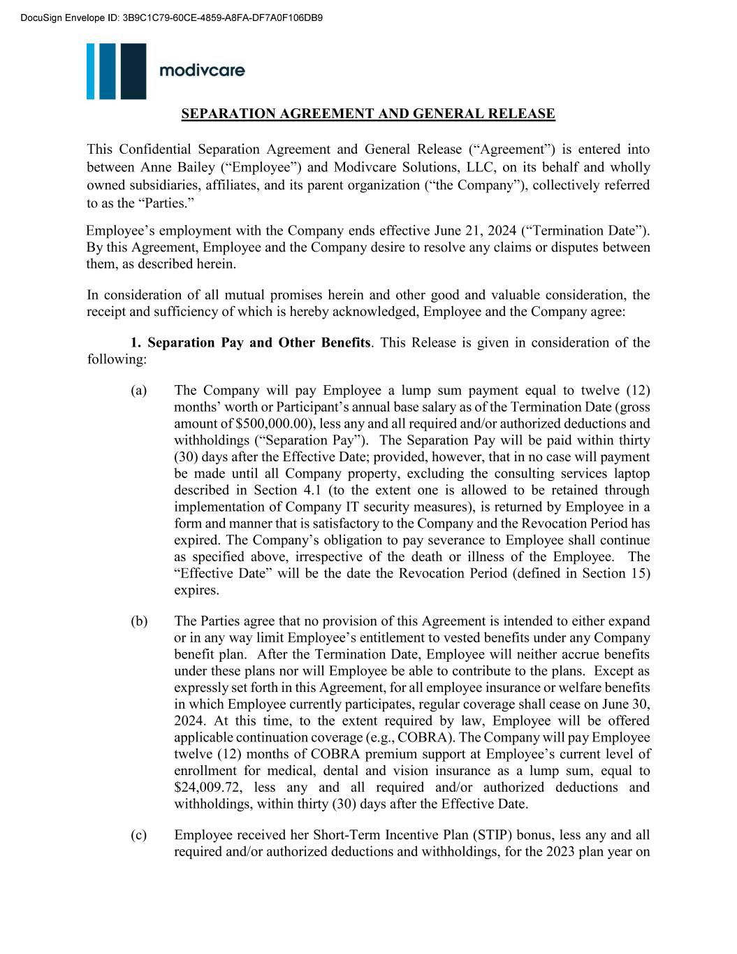 SEPARATION AGREEMENT AND GENERAL RELEASE between Anne Bailey care Solutions, LLC, on its behalf and wholly owned subsidiaries, affiliates, and its parent organization ends effective June 21, 2024 . By this Agreement, Employee and the Company desire to resolve any claims or disputes between them, as described herein. In consideration of all mutual promises herein and other good and valuable consideration, the receipt and sufficiency of which is hereby acknowledged, Employee and the Company agree: 1. Separation Pay and Other Benefits. This Release is given in consideration of the following: (a) The Company will pay Employee a lump sum payment equal to twelve (12) gross amount of $500,000.00), less any and all required and/or authorized deductions and . The Separation Pay will be paid within thirty (30) days after the Effective Date; provided, however, that in no case will payment be made until all Company property, excluding the consulting services laptop described in Section 4.1 (to the extent one is allowed to be retained through implementation of Company IT security measures), is returned by Employee in a form and manner that is satisfactory to the Company and the Revocation Period has expired. The Company s obligation to pay severance to Employee shall continue as specified above, irrespective of the death or illness of the Employee. The 5) expires. (b) The Parties agree that no provision of this Agreement is intended to either expand o vested benefits under any Company benefit plan. After the Termination Date, Employee will neither accrue benefits under these plans nor will Employee be able to contribute to the plans. Except as expressly set forth in this Agreement, for all employee insurance or welfare benefits in which Employee currently participates, regular coverage shall cease on June 30, 2024. At this time, to the extent required by law, Employee will be offered applicable continuation coverage (e.g., COBRA). The Company will pay Employee twelve (12) months of COBRA premium support at current level of enrollment for medical, dental and vision insurance as a lump sum, equal to $24,009.72, less any and all required and/or authorized deductions and withholdings, within thirty (30) days after the Effective Date. (c) Employee received her Short-Term Incentive Plan (STIP) bonus, less any and all required and/or authorized deductions and withholdings, for the 2023 plan year on