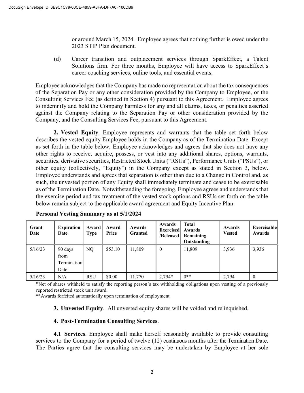 2 or around March 15, 2024. Employee agrees that nothing further is owed under the 2023 STIP Plan document. (d) Career transition and outplacement services through SparkEffect, a Talent Solutions firm. For three months, Employee will have access to SparkEffect career coaching services, online tools, and essential events. Employee acknowledges that the Company has made no representation about the tax consequences of the Separation Pay or any other consideration provided by the Company to Employee, or the Consulting Services Fee (as defined in Section 4) pursuant to this Agreement. Employee agrees to indemnify and hold the Company harmless for any and all claims, taxes, or penalties asserted against the Company relating to the Separation Pay or other consideration provided by the Company, and the Consulting Services Fee, pursuant to this Agreement. 2. Vested Equity. Employee represents and warrants that the table set forth below describes the vested equity Employee holds in the Company as of the Termination Date. Except as set forth in the table below, Employee acknowledges and agrees that she does not have any other rights to receive, acquire, possess, or vest into any additional shares, options, warrants, securities, derivative securities, Restricted Stock Units Performance except as stated in Section 3, below. Employee understands and agrees that separation is other than due to a Change in Control and, as such, the unvested portion of any Equity shall immediately terminate and cease to be exercisable as of the Termination Date. Notwithstanding the foregoing, Employee agrees and understands that the exercise period and tax treatment of the vested stock options and RSUs set forth on the table below remain subject to the applicable award agreement and Equity Incentive Plan. Personal Vesting Summary as at 5/1/2024 *Net of shares withheld to satisfy the reporting person s tax withholding obligations upon vesting of a previously reported restricted stock unit award. **Awards forfeited automatically upon termination of employment. 3. Unvested Equity. All unvested equity shares will be voided and relinquished. 4. Post-Termination Consulting Services. 4.1 Services. Employee shall make herself reasonably available to provide consulting services to the Company for a period of twelve (12) continuous months after the Termination Date. The Parties agree that the consulting services may be undertaken by Employee at her sole Grant Date Expiration Date Award Type Award Price Awards Granted Awards Exercised /Released Total Awards Remaining Outstanding Awards Vested Exercisable Awards 5/16/23 90 days from Termination Date NQ $53.10 11,809 0 11,809 3,936 3,936 5/16/23 N/A RSU $0.00 11,770 2,794* 0** 2,794 0