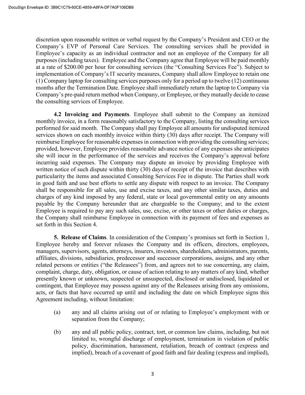 3 discretion upon reasonable written or verbal request by the Company the C . The consulting services shall be provided in capacity as an individual contractor and not an employee of the Company for all purposes (including taxes). Employee and the Company agree that Employee will be paid monthly at a rate of $200.00 per hour for consulting services ( Consulting Services Fee Subject to (1) Company laptop for consulting services purposes only for a period up to twelve (12) continuous months after the Termination Date. Employee shall immediately return the laptop to Company via -paid return method when Company, or Employee, or they mutually decide to cease the consulting services of Employee. 4.2 Invoicing and Payments. Employee shall submit to the Company an itemized monthly invoice, in a form reasonably satisfactory to the Company, listing the consulting services performed for said month. The Company shall pay Employee all amounts for undisputed itemized services shown on each monthly invoice within thirty (30) days after receipt. The Company will reimburse Employee for reasonable expenses in connection with providing the consulting services; provided, however, Employee provides reasonable advance notice of any expenses she anticipates she will incur in the performance of the services and receives the Company approval before incurring said expenses. The Company may dispute an invoice by providing Employee with written notice of such dispute within thirty (30) days of receipt of the invoice that describes with particularity the items and associated Consulting Services Fee in dispute. The Parties shall work in good faith and use best efforts to settle any dispute with respect to an invoice. The Company shall be responsible for all sales, use and excise taxes, and any other similar taxes, duties and charges of any kind imposed by any federal, state or local governmental entity on any amounts payable by the Company hereunder that are chargeable to the Company; and to the extent Employee is required to pay any such sales, use, excise, or other taxes or other duties or charges, the Company shall reimburse Employee in connection with its payment of fees and expenses as set forth in this Section 4. 5. Release of Claims. promises set forth in Section 1, Employee hereby and forever releases the Company and its officers, directors, employees, managers, supervisors, agents, attorneys, insurers, investors, shareholders, administrators, parents, affiliates, divisions, subsidiaries, predecessor and successor corporations, assigns, and any other complaint, charge, duty, obligation, or cause of action relating to any matters of any kind, whether presently known or unknown, suspected or unsuspected, disclosed or undisclosed, liquidated or contingent, that Employee may possess against any of the Releasees arising from any omissions, acts, or facts that have occurred up until and including the date on which Employee signs this Agreement including, without limitation: (a) separation from the Company; (b) any and all public policy, contract, tort, or common law claims, including, but not limited to, wrongful discharge of employment, termination in violation of public policy, discrimination, harassment, retaliation, breach of contract (express and implied), breach of a covenant of good faith and fair dealing (express and implied),