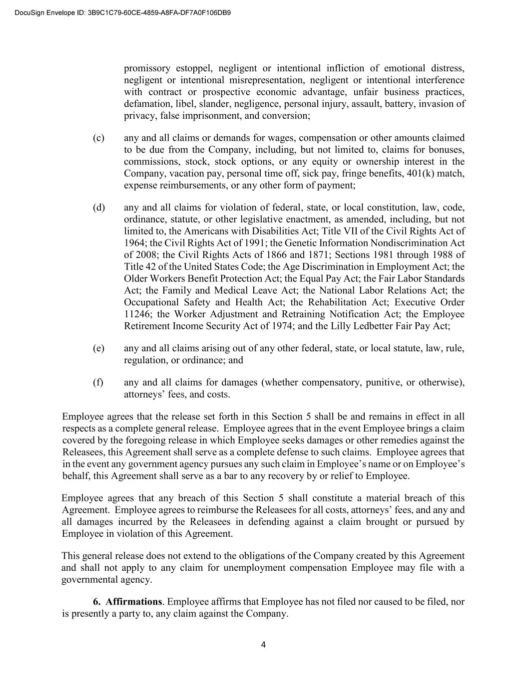 4 promissory estoppel, negligent or intentional infliction of emotional distress, negligent or intentional misrepresentation, negligent or intentional interference with contract or prospective economic advantage, unfair business practices, defamation, libel, slander, negligence, personal injury, assault, battery, invasion of privacy, false imprisonment, and conversion; (c) any and all claims or demands for wages, compensation or other amounts claimed to be due from the Company, including, but not limited to, claims for bonuses, commissions, stock, stock options, or any equity or ownership interest in the Company, vacation pay, personal time off, sick pay, fringe benefits, 401(k) match, expense reimbursements, or any other form of payment; (d) any and all claims for violation of federal, state, or local constitution, law, code, ordinance, statute, or other legislative enactment, as amended, including, but not limited to, the Americans with Disabilities Act; Title VII of the Civil Rights Act of 1964; the Civil Rights Act of 1991; the Genetic Information Nondiscrimination Act of 2008; the Civil Rights Acts of 1866 and 1871; Sections 1981 through 1988 of Title 42 of the United States Code; the Age Discrimination in Employment Act; the Older Workers Benefit Protection Act; the Equal Pay Act; the Fair Labor Standards Act; the Family and Medical Leave Act; the National Labor Relations Act; the Occupational Safety and Health Act; the Rehabilitation Act; Executive Order 11246; the Worker Adjustment and Retraining Notification Act; the Employee Retirement Income Security Act of 1974; and the Lilly Ledbetter Fair Pay Act; (e) any and all claims arising out of any other federal, state, or local statute, law, rule, regulation, or ordinance; and (f) any and all claims for damages (whether compensatory, punitive, or otherwise), Employee agrees that the release set forth in this Section 5 shall be and remains in effect in all respects as a complete general release. Employee agrees that in the event Employee brings a claim covered by the foregoing release in which Employee seeks damages or other remedies against the Releasees, this Agreement shall serve as a complete defense to such claims. Employee agrees that behalf, this Agreement shall serve as a bar to any recovery by or relief to Employee. Employee agrees that any breach of this Section 5 shall constitute a material breach of this Agreement. Employee agrees to reimburse the Releasees f all damages incurred by the Releasees in defending against a claim brought or pursued by Employee in violation of this Agreement. This general release does not extend to the obligations of the Company created by this Agreement and shall not apply to any claim for unemployment compensation Employee may file with a governmental agency. 6. Affirmations. Employee affirms that Employee has not filed nor caused to be filed, nor is presently a party to, any claim against the Company.