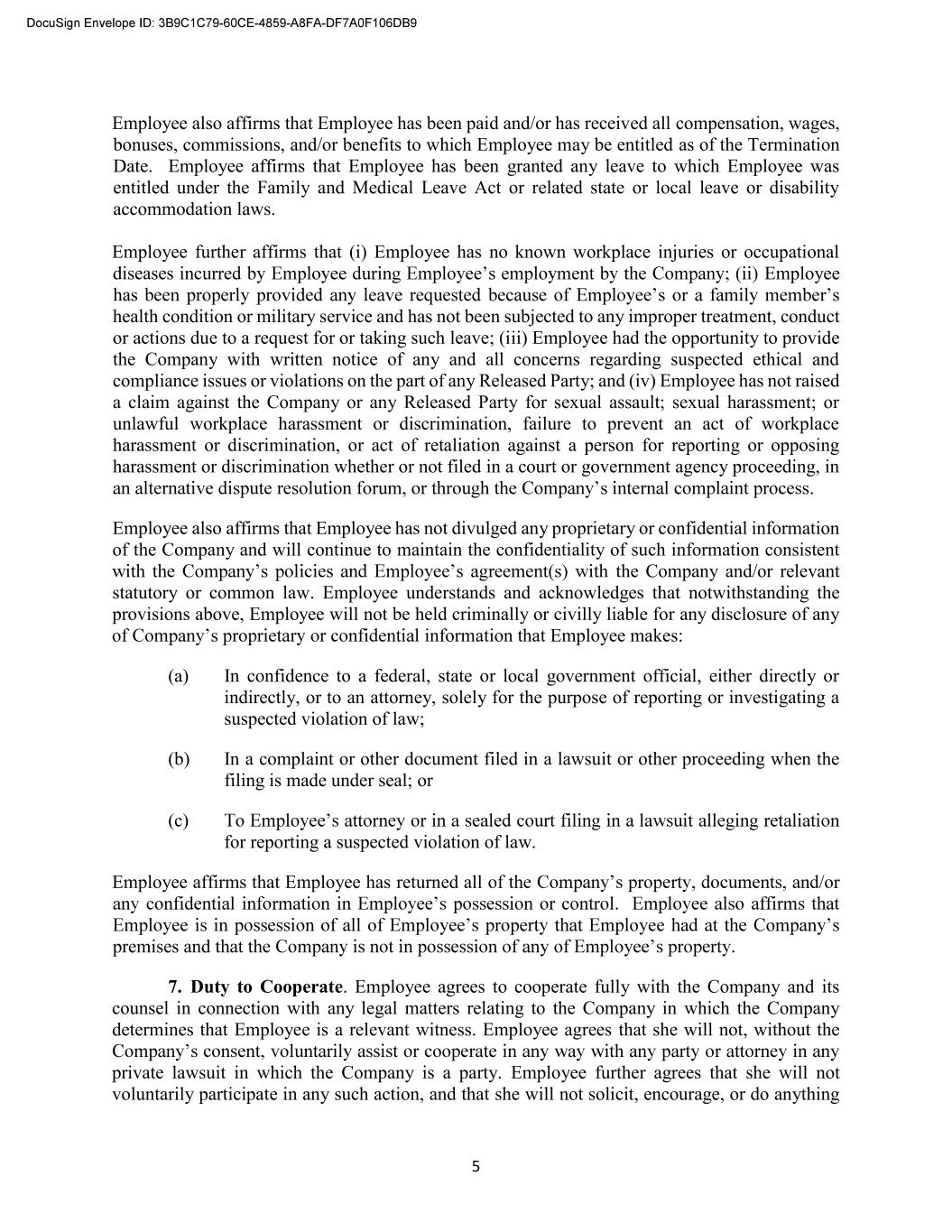 5 Employee also affirms that Employee has been paid and/or has received all compensation, wages, bonuses, commissions, and/or benefits to which Employee may be entitled as of the Termination Date. Employee affirms that Employee has been granted any leave to which Employee was entitled under the Family and Medical Leave Act or related state or local leave or disability accommodation laws. Employee further affirms that (i) Employee has no known workplace injuries or occupational diseases Employee has health condition or military service and has not been subjected to any improper treatment, conduct or actions due to a request for or taking such leave; (iii) Employee had the opportunity to provide the Company with written notice of any and all concerns regarding suspected ethical and compliance issues or violations on the part of any Released Party; and (iv) Employee has not raised a claim against the Company or any Released Party for sexual assault; sexual harassment; or unlawful workplace harassment or discrimination, failure to prevent an act of workplace harassment or discrimination, or act of retaliation against a person for reporting or opposing harassment or discrimination whether or not filed in a court or government agency proceeding, in . Employee also affirms that Employee has not divulged any proprietary or confidential information of the Company and will continue to maintain the confidentiality of such information consistent the Company and/or relevant statutory or common law. Employee understands and acknowledges that notwithstanding the provisions above, Employee will not be held criminally or civilly liable for any disclosure of any information that Employee makes: (a) In confidence to a federal, state or local government official, either directly or indirectly, or to an attorney, solely for the purpose of reporting or investigating a suspected violation of law; (b) In a complaint or other document filed in a lawsuit or other proceeding when the filing is made under seal; or (c) for reporting a suspected violation of law. Employee affirms that Employee has returned all premises and 7. Duty to Cooperate. Employee agrees to cooperate fully with the Company and its counsel in connection with any legal matters relating to the Company in which the Company determines that Employee is a relevant witness. Employee agrees that she will not, without the private lawsuit in which the Company is a party. Employee further agrees that she will not voluntarily participate in any such action, and that she will not solicit, encourage, or do anything