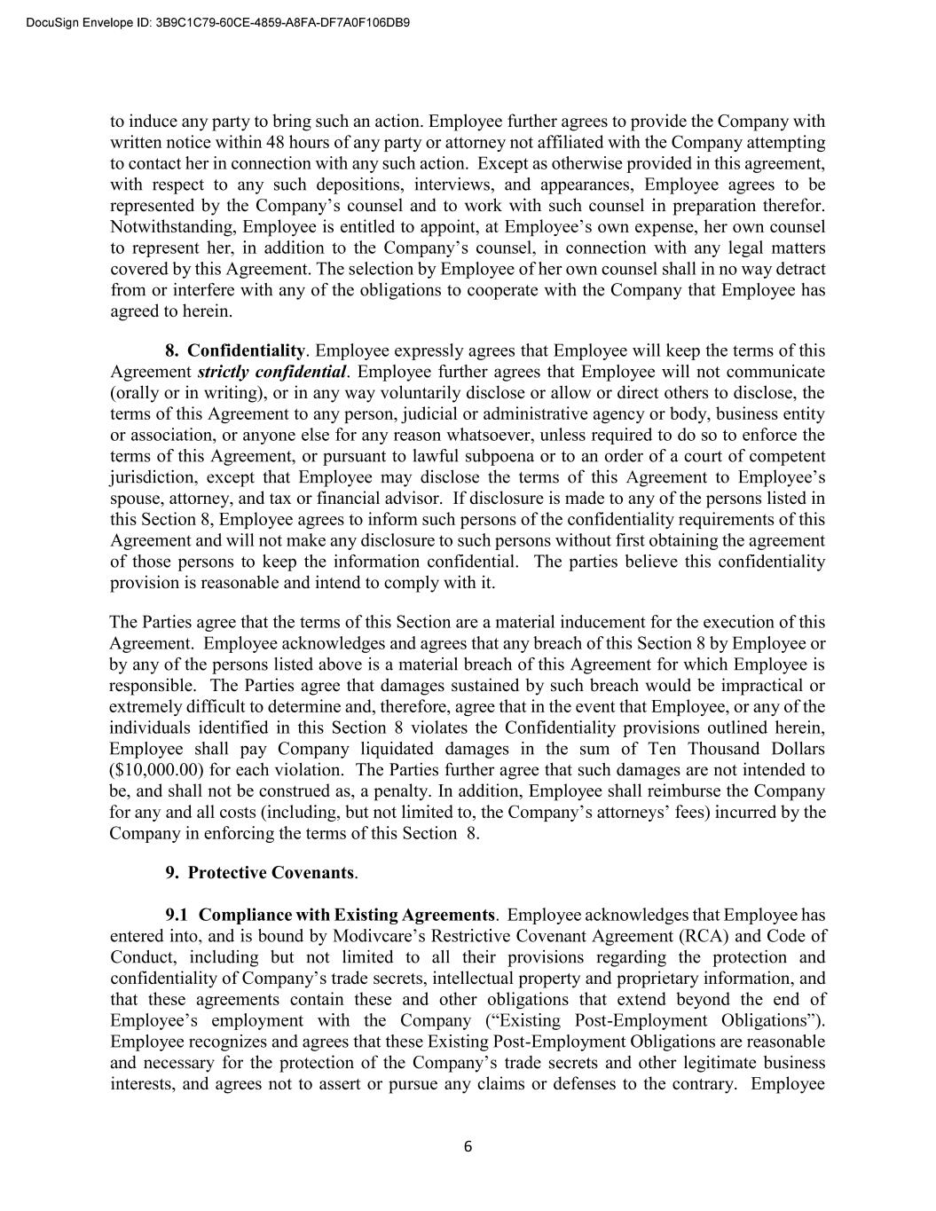6 to induce any party to bring such an action. Employee further agrees to provide the Company with written notice within 48 hours of any party or attorney not affiliated with the Company attempting to contact her in connection with any such action. Except as otherwise provided in this agreement, with respect to any such depositions, interviews, and appearances, Employee agrees to be represented by t Notwithstanding, Employee is entitled to appoint, at own expense, her own counsel to represent her tters covered by this Agreement. The selection by Employee of her own counsel shall in no way detract from or interfere with any of the obligations to cooperate with the Company that Employee has agreed to herein. 8. Confidentiality. Employee expressly agrees that Employee will keep the terms of this Agreement strictly confidential. Employee further agrees that Employee will not communicate (orally or in writing), or in any way voluntarily disclose or allow or direct others to disclose, the terms of this Agreement to any person, judicial or administrative agency or body, business entity or association, or anyone else for any reason whatsoever, unless required to do so to enforce the terms of this Agreement, or pursuant to lawful subpoena or to an order of a court of competent spouse, attorney, and tax or financial advisor. If disclosure is made to any of the persons listed in this Section 8, Employee agrees to inform such persons of the confidentiality requirements of this Agreement and will not make any disclosure to such persons without first obtaining the agreement of those persons to keep the information confidential. The parties believe this confidentiality provision is reasonable and intend to comply with it. The Parties agree that the terms of this Section are a material inducement for the execution of this Agreement. Employee acknowledges and agrees that any breach of this Section 8 by Employee or by any of the persons listed above is a material breach of this Agreement for which Employee is responsible. The Parties agree that damages sustained by such breach would be impractical or extremely difficult to determine and, therefore, agree that in the event that Employee, or any of the individuals identified in this Section 8 violates the Confidentiality provisions outlined herein, Employee shall pay Company liquidated damages in the sum of Ten Thousand Dollars ($10,000.00) for each violation. The Parties further agree that such damages are not intended to be, and shall not be construed as, a penalty. In addition, Employee shall reimburse the Company curred by the Company in enforcing the terms of this Section 8. 9. Protective Covenants. 9.1 Compliance with Existing Agreements. Employee acknowledges that Employee has and Code of Conduct, including but not limited to all their provisions regarding the protection and confidentiality of Company , intellectual property and proprietary information, and that these agreements contain these and other obligations that extend beyond the end of - Employee recognizes and agrees that these Existing Post-Employment Obligations are reasonable trade secrets and other legitimate business interests, and agrees not to assert or pursue any claims or defenses to the contrary. Employee
