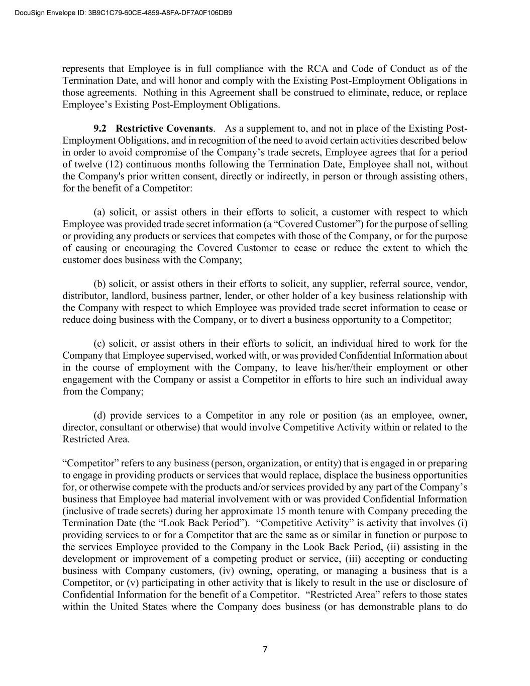 7 represents that Employee is in full compliance with the RCA and Code of Conduct as of the Termination Date, and will honor and comply with the Existing Post-Employment Obligations in those agreements. Nothing in this Agreement shall be construed to eliminate, reduce, or replace -Employment Obligations. 9.2 Restrictive Covenants. As a supplement to, and not in place of the Existing Post- Employment Obligations, and in recognition of the need to avoid certain activities described below that for a period of twelve (12) continuous months following the Termination Date, Employee shall not, without the Company's prior written consent, directly or indirectly, in person or through assisting others, for the benefit of a Competitor: (a) solicit, or assist others in their efforts to solicit, a customer with respect to which Employee for the purpose of selling or providing any products or services that competes with those of the Company, or for the purpose of causing or encouraging the Covered Customer to cease or reduce the extent to which the customer does business with the Company; (b) solicit, or assist others in their efforts to solicit, any supplier, referral source, vendor, distributor, landlord, business partner, lender, or other holder of a key business relationship with the Company with respect to which Employee was provided trade secret information to cease or reduce doing business with the Company, or to divert a business opportunity to a Competitor; (c) solicit, or assist others in their efforts to solicit, an individual hired to work for the Company that Employee supervised, worked with, or was provided Confidential Information about in the course of employment with the Company, to leave his/her/their employment or other engagement with the Company or assist a Competitor in efforts to hire such an individual away from the Company; (d) provide services to a Competitor in any role or position (as an employee, owner, director, consultant or otherwise) that would involve Competitive Activity within or related to the Restricted Area. , organization, or entity) that is engaged in or preparing to engage in providing products or services that would replace, displace the business opportunities business that Employee had material involvement with or was provided Confidential Information (inclusive of trade secrets) during her approximate 15 month tenure with Company preceding the providing services to or for a Competitor that are the same as or similar in function or purpose to the services Employee provided to the Company in the Look Back Period, (ii) assisting in the development or improvement of a competing product or service, (iii) accepting or conducting business with Company customers, (iv) owning, operating, or managing a business that is a Competitor, or (v) participating in other activity that is likely to result in the use or disclosure of Confidential Information for the benefit of a Competitor. within the United States where the Company does business (or has demonstrable plans to do