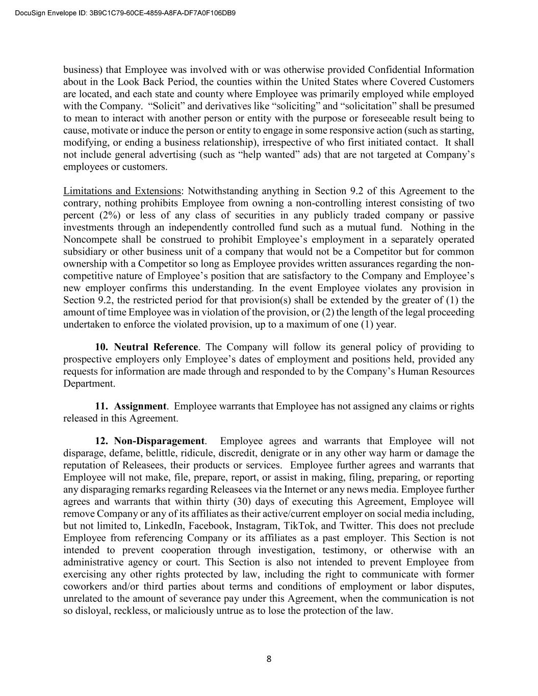 8 business) that Employee was involved with or was otherwise provided Confidential Information about in the Look Back Period, the counties within the United States where Covered Customers are located, and each state and county where Employee was primarily employed while employed with the Company. to mean to interact with another person or entity with the purpose or foreseeable result being to cause, motivate or induce the person or entity to engage in some responsive action (such as starting, modifying, or ending a business relationship), irrespective of who first initiated contact. It shall not include general adv Company employees or customers. Limitations and Extensions: Notwithstanding anything in Section 9.2 of this Agreement to the contrary, nothing prohibits Employee from owning a non-controlling interest consisting of two percent (2%) or less of any class of securities in any publicly traded company or passive investments through an independently controlled fund such as a mutual fund. Nothing in the Noncompete shall subsidiary or other business unit of a company that would not be a Competitor but for common ownership with a Competitor so long as Employee provides written assurances regarding the non- new employer confirms this understanding. In the event Employee violates any provision in Section 9.2, the restricted period for that provision(s) shall be extended by the greater of (1) the amount of time Employee was in violation of the provision, or (2) the length of the legal proceeding undertaken to enforce the violated provision, up to a maximum of one (1) year. 10. Neutral Reference. The Company will follow its general policy of providing to Department. 11. Assignment. Employee warrants that Employee has not assigned any claims or rights released in this Agreement. 12. Non-Disparagement. Employee agrees and warrants that Employee will not disparage, defame, belittle, ridicule, discredit, denigrate or in any other way harm or damage the reputation of Releasees, their products or services. Employee further agrees and warrants that Employee will not make, file, prepare, report, or assist in making, filing, preparing, or reporting any disparaging remarks regarding Releasees via the Internet or any news media. Employee further agrees and warrants that within thirty (30) days of executing this Agreement, Employee will remove Company or any of its affiliates as their active/current employer on social media including, but not limited to, LinkedIn, Facebook, Instagram, TikTok, and Twitter. This does not preclude Employee from referencing Company or its affiliates as a past employer. This Section is not intended to prevent cooperation through investigation, testimony, or otherwise with an administrative agency or court. This Section is also not intended to prevent Employee from exercising any other rights protected by law, including the right to communicate with former coworkers and/or third parties about terms and conditions of employment or labor disputes, unrelated to the amount of severance pay under this Agreement, when the communication is not so disloyal, reckless, or maliciously untrue as to lose the protection of the law.