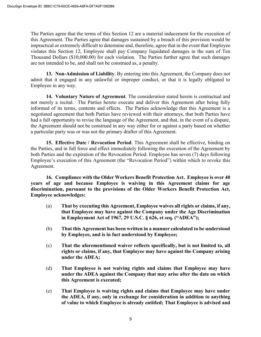 9 The Parties agree that the terms of this Section 12 are a material inducement for the execution of this Agreement. The Parties agree that damages sustained by a breach of this provision would be impractical or extremely difficult to determine and, therefore, agree that in the event that Employee violates this Section 12, Employee shall pay Company liquidated damages in the sum of Ten Thousand Dollars ($10,000.00) for each violation. The Parties further agree that such damages are not intended to be, and shall not be construed as, a penalty. 13. Non-Admission of Liability. By entering into this Agreement, the Company does not admit that it engaged in any unlawful or improper conduct, or that it is legally obligated to Employee in any way. 14. Voluntary Nature of Agreement. The consideration stated herein is contractual and not merely a recital. The Parties hereto execute and deliver this Agreement after being fully informed of its terms, contents and effects. The Parties acknowledge that this Agreement is a negotiated agreement that both Parties have reviewed with their attorneys, that both Parties have had a full opportunity to revise the language of the Agreement, and that, in the event of a dispute, the Agreement should not be construed in any way either for or against a party based on whether a particular party was or was not the primary drafter of this Agreement. 15. Effective Date / Revocation Period. This Agreement shall be effective, binding on the Parties, and in full force and effect immediately following the execution of the Agreement by both Parties and the expiration of the Revocation Period. Employee has seven (7) days following Agreement. 16. Compliance with the Older Workers Benefit Protection Act. Employee is over 40 years of age and because Employee is waiving in this Agreement claims for age discrimination, pursuant to the provisions of the Older Workers Benefit Protection Act, Employee acknowledges: (a) That by executing this Agreement, Employee waives all rights or claims, if any, that Employee may have against the Company under the Age Discrimination (b) That this Agreement has been written in a manner calculated to be understood by Employee, and is in fact understood by Employee; (c) That the aforementioned waiver reflects specifically, but is not limited to, all rights or claims, if any, that Employee may have against the Company arising under the ADEA; (d) That Employee is not waiving rights and claims that Employee may have under the ADEA against the Company that may arise after the date on which this Agreement is executed; (e) That Employee is waiving rights and claims that Employee may have under the ADEA, if any, only in exchange for consideration in addition to anything of value to which Employee is already entitled; That Employee is advised and