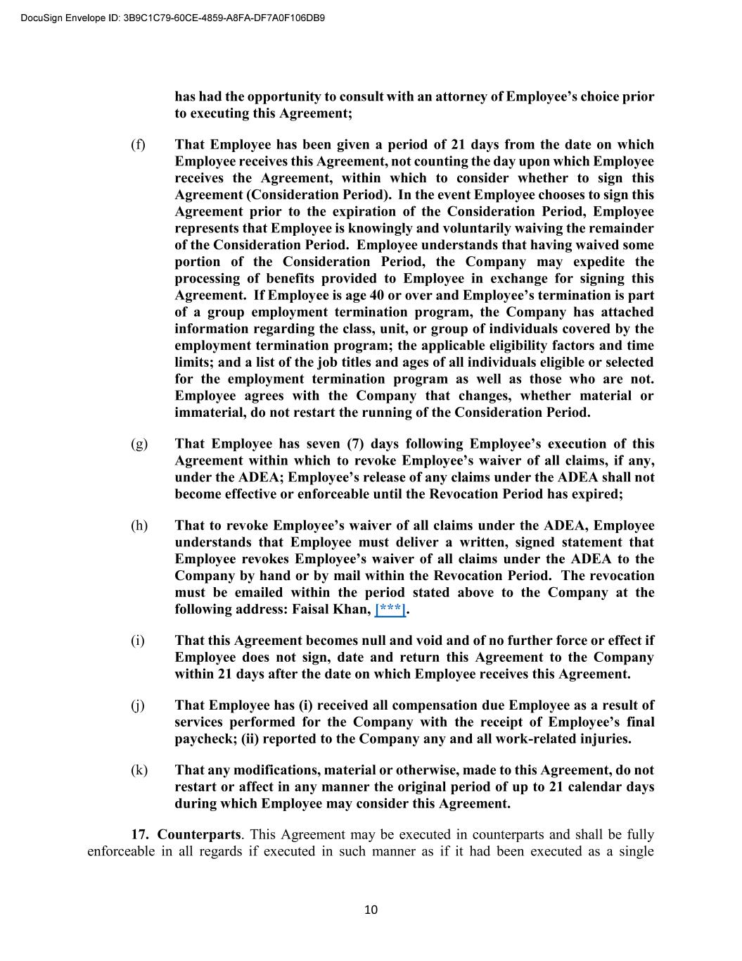 10 to executing this Agreement; (f) That Employee has been given a period of 21 days from the date on which Employee receives this Agreement, not counting the day upon which Employee receives the Agreement, within which to consider whether to sign this Agreement (Consideration Period). In the event Employee chooses to sign this Agreement prior to the expiration of the Consideration Period, Employee represents that Employee is knowingly and voluntarily waiving the remainder of the Consideration Period. Employee understands that having waived some portion of the Consideration Period, the Company may expedite the processing of benefits provided to Employee in exchange for signing this Agreement. of a group employment termination program, the Company has attached information regarding the class, unit, or group of individuals covered by the employment termination program; the applicable eligibility factors and time limits; and a list of the job titles and ages of all individuals eligible or selected for the employment termination program as well as those who are not. Employee agrees with the Company that changes, whether material or immaterial, do not restart the running of the Consideration Period. (g) That Employee has seven (7) Agreement within which under the ADEA; become effective or enforceable until the Revocation Period has expired; (h) laims under the ADEA, Employee understands that Employee must deliver a written, signed statement that Company by hand or by mail within the Revocation Period. The revocation must be emailed within the period stated above to the Company at the following address: Faisal Khan, [***]. (i) That this Agreement becomes null and void and of no further force or effect if Employee does not sign, date and return this Agreement to the Company within 21 days after the date on which Employee receives this Agreement. (j) That Employee has (i) received all compensation due Employee as a result of services performed for the Company with paycheck; (ii) reported to the Company any and all work-related injuries. (k) That any modifications, material or otherwise, made to this Agreement, do not restart or affect in any manner the original period of up to 21 calendar days during which Employee may consider this Agreement. 17. Counterparts. This Agreement may be executed in counterparts and shall be fully enforceable in all regards if executed in such manner as if it had been executed as a single