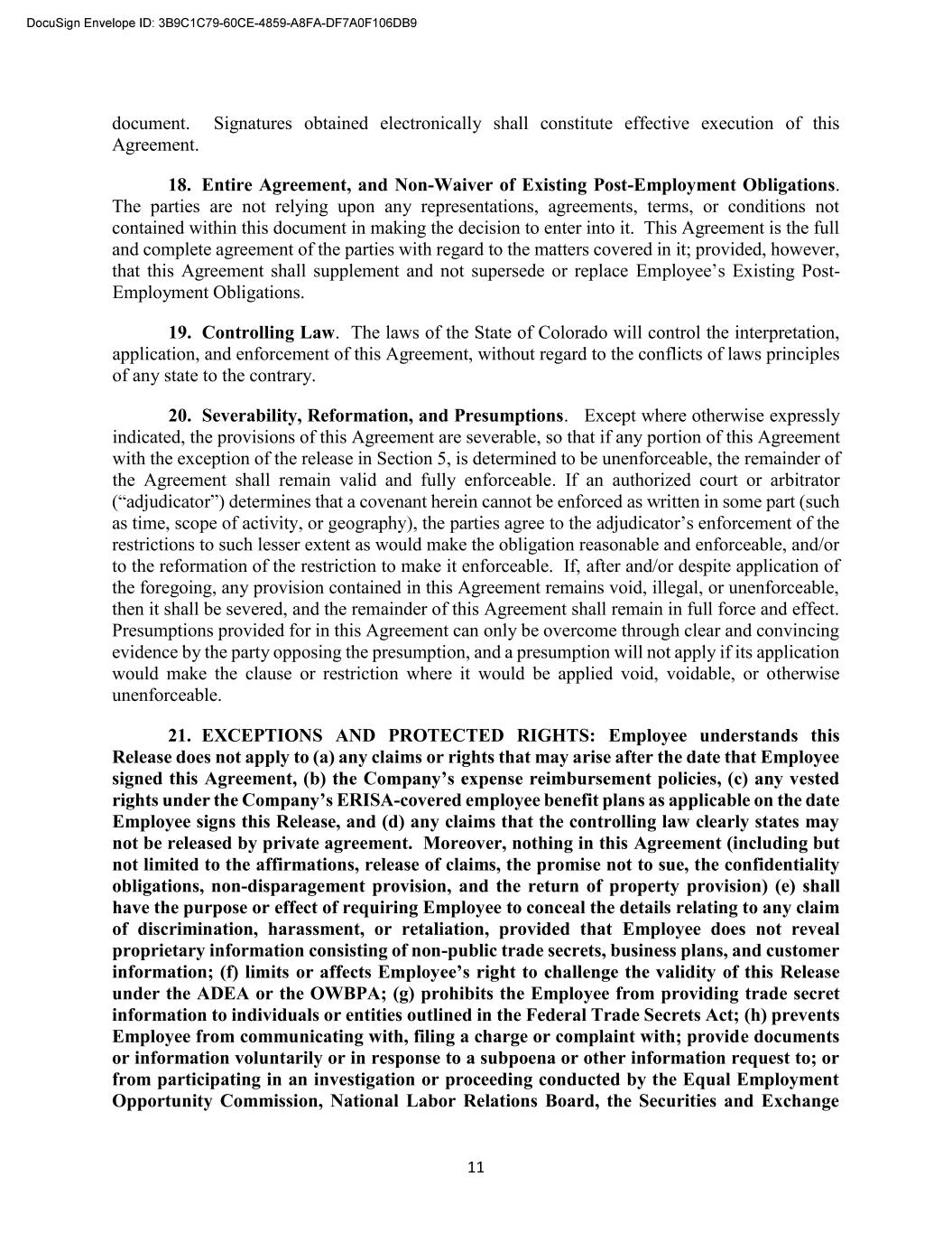 11 document. Signatures obtained electronically shall constitute effective execution of this Agreement. 18. Entire Agreement, and Non-Waiver of Existing Post-Employment Obligations. The parties are not relying upon any representations, agreements, terms, or conditions not contained within this document in making the decision to enter into it. This Agreement is the full and complete agreement of the parties with regard to the matters covered in it; provided, however, that this Agreement shall supplement and not supersede or replace Em Existing Post- Employment Obligations. 19. Controlling Law. The laws of the State of Colorado will control the interpretation, application, and enforcement of this Agreement, without regard to the conflicts of laws principles of any state to the contrary. 20. Severability, Reformation, and Presumptions. Except where otherwise expressly indicated, the provisions of this Agreement are severable, so that if any portion of this Agreement with the exception of the release in Section 5, is determined to be unenforceable, the remainder of the Agreement shall remain valid and fully enforceable. If an authorized court or arbitrator as time, sc restrictions to such lesser extent as would make the obligation reasonable and enforceable, and/or to the reformation of the restriction to make it enforceable. If, after and/or despite application of the foregoing, any provision contained in this Agreement remains void, illegal, or unenforceable, then it shall be severed, and the remainder of this Agreement shall remain in full force and effect. Presumptions provided for in this Agreement can only be overcome through clear and convincing evidence by the party opposing the presumption, and a presumption will not apply if its application would make the clause or restriction where it would be applied void, voidable, or otherwise unenforceable. 21. EXCEPTIONS AND PROTECTED RIGHTS: Employee understands this Release does not apply to (a) any claims or rights that may arise after the date that Employee signed this Agreement -covered employee benefit plans as applicable on the date Employee signs this Release, and (d) any claims that the controlling law clearly states may not be released by private agreement. Moreover, nothing in this Agreement (including but not limited to the affirmations, release of claims, the promise not to sue, the confidentiality obligations, non-disparagement provision, and the return of property provision) (e) shall have the purpose or effect of requiring Employee to conceal the details relating to any claim of discrimination, harassment, or retaliation, provided that Employee does not reveal proprietary information consisting of non-public trade secrets, business plans, and customer information; (f under the ADEA or the OWBPA; (g) prohibits the Employee from providing trade secret information to individuals or entities outlined in the Federal Trade Secrets Act; (h) prevents Employee from communicating with, filing a charge or complaint with; provide documents or information voluntarily or in response to a subpoena or other information request to; or from participating in an investigation or proceeding conducted by the Equal Employment Opportunity Commission, National Labor Relations Board, the Securities and Exchange