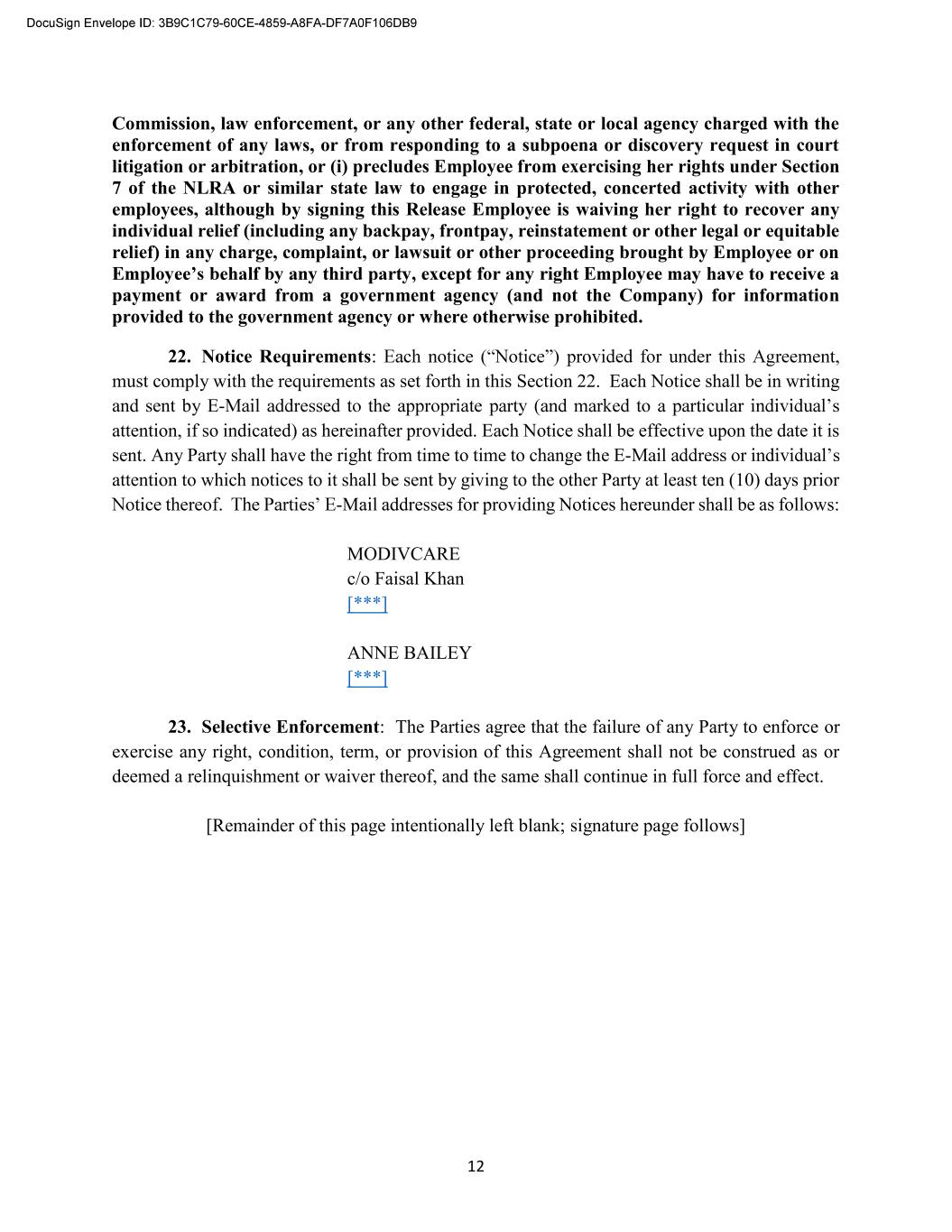 12 Commission, law enforcement, or any other federal, state or local agency charged with the enforcement of any laws, or from responding to a subpoena or discovery request in court litigation or arbitration, or (i) precludes Employee from exercising her rights under Section 7 of the NLRA or similar state law to engage in protected, concerted activity with other employees, although by signing this Release Employee is waiving her right to recover any individual relief (including any backpay, frontpay, reinstatement or other legal or equitable relief) in any charge, complaint, or lawsuit or other proceeding brought by Employee or on payment or award from a government agency (and not the Company) for information provided to the government agency or where otherwise prohibited. 22. Notice Requirements must comply with the requirements as set forth in this Section 22. Each Notice shall be in writing and sent by E- attention, if so indicated) as hereinafter provided. Each Notice shall be effective upon the date it is sent. Any Party shall have the right from time to time to change the E- attention to which notices to it shall be sent by giving to the other Party at least ten (10) days prior -Mail addresses for providing Notices hereunder shall be as follows: MODIVCARE c/o Faisal Khan [***] ANNE BAILEY [***] 23. Selective Enforcement: The Parties agree that the failure of any Party to enforce or exercise any right, condition, term, or provision of this Agreement shall not be construed as or deemed a relinquishment or waiver thereof, and the same shall continue in full force and effect. [Remainder of this page intentionally left blank; signature page follows]