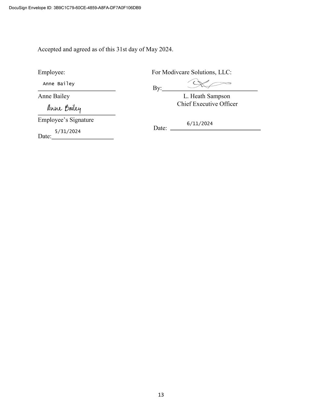 13 Accepted and agreed as of this 31st day of May 2024. Employee: For Modivcare Solutions, LLC: By: Anne Bailey L. Heath Sampson Chief Executive Officer Date: Date: