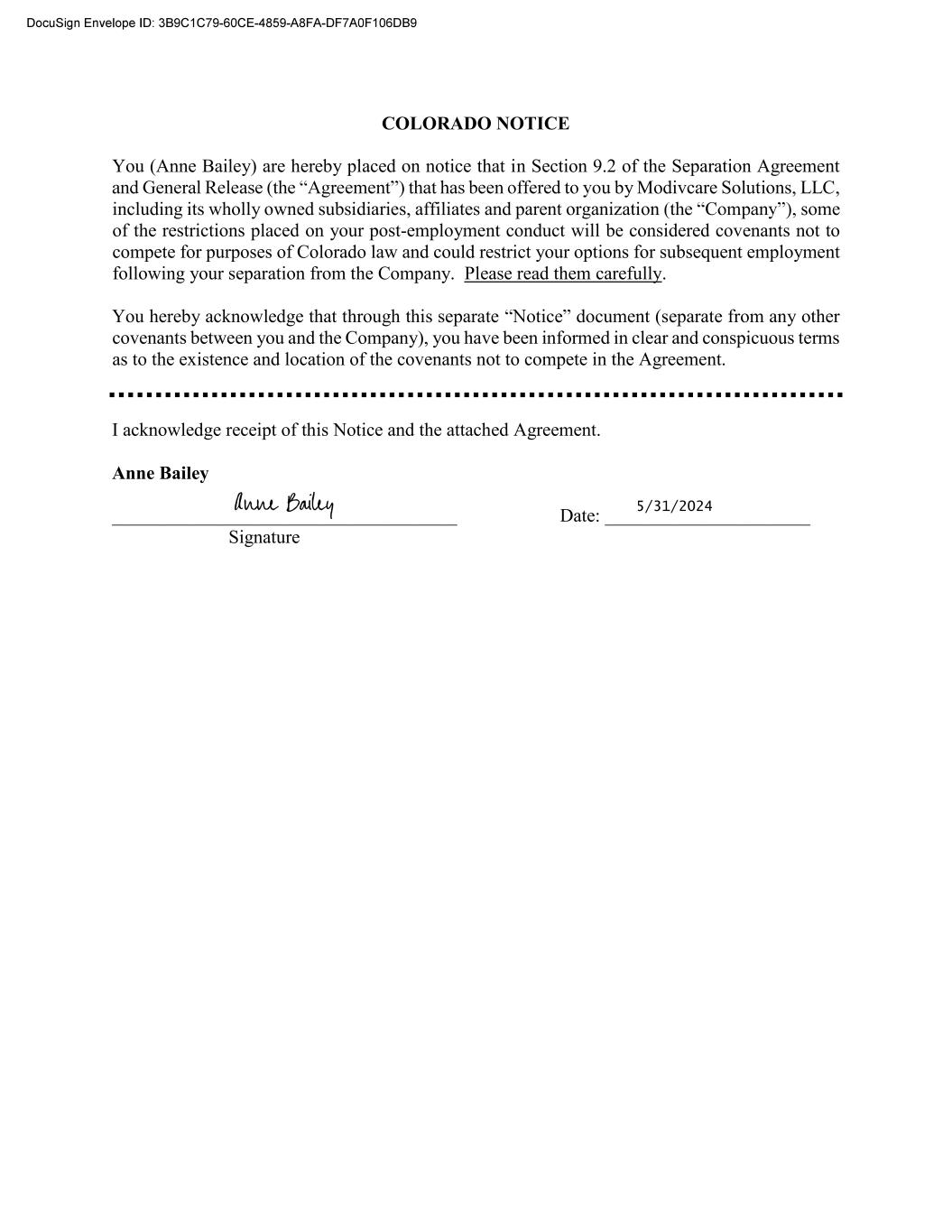 COLORADO NOTICE You (Anne Bailey) are hereby placed on notice that in Section 9.2 of the Separation Agreement by Modivcare Solutions, LLC, including its wholly owned subsidiaries, affiliates and parent organization some of the restrictions placed on your post-employment conduct will be considered covenants not to compete for purposes of Colorado law and could restrict your options for subsequent employment following your separation from the Company. Please read them carefully. You hereby acknowledge that through this separate otice document (separate from any other covenants between you and the Company), you have been informed in clear and conspicuous terms as to the existence and location of the covenants not to compete in the Agreement. I acknowledge receipt of this Notice and the attached Agreement. Anne Bailey _____________________________________ Date: ______________________ Signature
