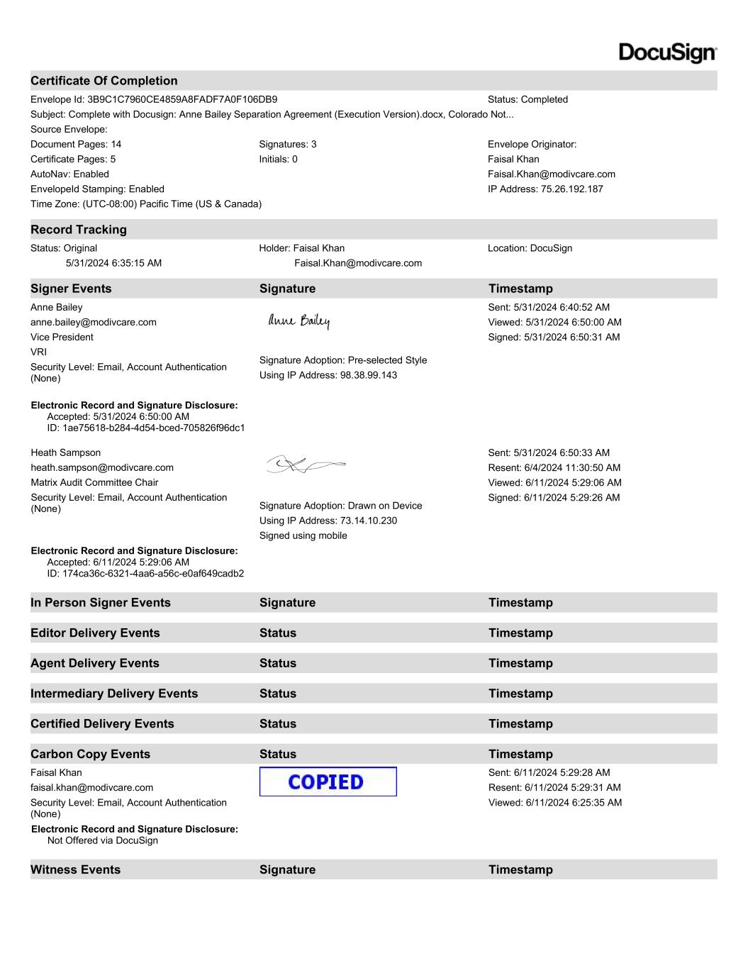 Certificate Of Completion Envelope Id: 3B9C1C7960CE4859A8FADF7A0F106DB9 Status: Completed Subject: Complete with Docusign: Anne Bailey Separation Agreement (Execution Version).docx, Colorado Not... Source Envelope: Document Pages: 14 Signatures: 3 Envelope Originator: Certificate Pages: 5 Initials: 0 Faisal Khan AutoNav: Enabled EnvelopeId Stamping: Enabled Time Zone: (UTC-08:00) Pacific Time (US & Canada) Faisal.Khan@modivcare.com IP Address: 75.26.192.187 Record Tracking Status: Original 5/31/2024 6:35:15 AM Holder: Faisal Khan Faisal.Khan@modivcare.com Location: DocuSign Signer Events Signature Timestamp Anne Bailey anne.bailey@modivcare.com Vice President VRI Security Level: Email, Account Authentication (None) Signature Adoption: Pre-selected Style Using IP Address: 98.38.99.143 Sent: 5/31/2024 6:40:52 AM Viewed: 5/31/2024 6:50:00 AM Signed: 5/31/2024 6:50:31 AM Electronic Record and Signature Disclosure: Accepted: 5/31/2024 6:50:00 AM ID: 1ae75618-b284-4d54-bced-705826f96dc1 Heath Sampson heath.sampson@modivcare.com Matrix Audit Committee Chair Security Level: Email, Account Authentication (None) Signature Adoption: Drawn on Device Using IP Address: 73.14.10.230 Signed using mobile Sent: 5/31/2024 6:50:33 AM Resent: 6/4/2024 11:30:50 AM Viewed: 6/11/2024 5:29:06 AM Signed: 6/11/2024 5:29:26 AM Electronic Record and Signature Disclosure: Accepted: 6/11/2024 5:29:06 AM ID: 174ca36c-6321-4aa6-a56c-e0af649cadb2 In Person Signer Events Signature Timestamp Editor Delivery Events Status Timestamp Agent Delivery Events Status Timestamp Intermediary Delivery Events Status Timestamp Certified Delivery Events Status Timestamp Carbon Copy Events Status Timestamp Faisal Khan faisal.khan@modivcare.com Security Level: Email, Account Authentication (None) Sent: 6/11/2024 5:29:28 AM Resent: 6/11/2024 5:29:31 AM Viewed: 6/11/2024 6:25:35 AM Electronic Record and Signature Disclosure: Not Offered via DocuSign Witness Events Signature Timestamp