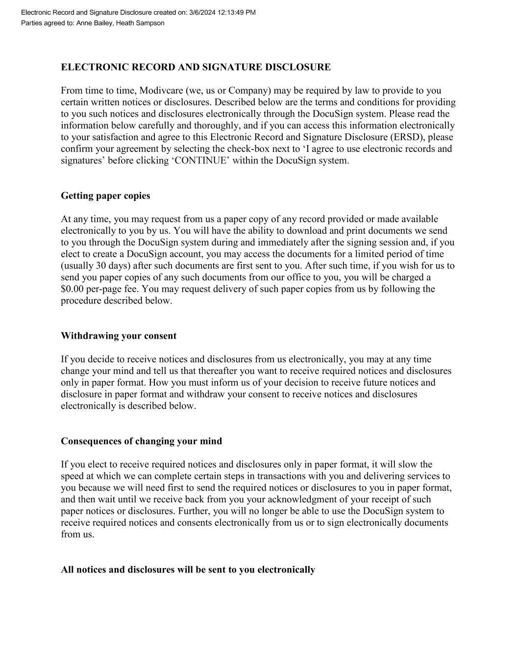 ELECTRONIC RECORD AND SIGNATURE DISCLOSURE From time to time, Modivcare (we, us or Company) may be required by law to provide to you certain written notices or disclosures. Described below are the terms and conditions for providing to you such notices and disclosures electronically through the DocuSign system. Please read the information below carefully and thoroughly, and if you can access this information electronically to your satisfaction and agree to this Electronic Record and Signature Disclosure (ERSD), please confirm your agreement by selecting the check- Getting paper copies At any time, you may request from us a paper copy of any record provided or made available electronically to you by us. You will have the ability to download and print documents we send to you through the DocuSign system during and immediately after the signing session and, if you elect to create a DocuSign account, you may access the documents for a limited period of time (usually 30 days) after such documents are first sent to you. After such time, if you wish for us to send you paper copies of any such documents from our office to you, you will be charged a $0.00 per-page fee. You may request delivery of such paper copies from us by following the procedure described below. Withdrawing your consent If you decide to receive notices and disclosures from us electronically, you may at any time change your mind and tell us that thereafter you want to receive required notices and disclosures only in paper format. How you must inform us of your decision to receive future notices and disclosure in paper format and withdraw your consent to receive notices and disclosures electronically is described below. Consequences of changing your mind If you elect to receive required notices and disclosures only in paper format, it will slow the speed at which we can complete certain steps in transactions with you and delivering services to you because we will need first to send the required notices or disclosures to you in paper format, and then wait until we receive back from you your acknowledgment of your receipt of such paper notices or disclosures. Further, you will no longer be able to use the DocuSign system to receive required notices and consents electronically from us or to sign electronically documents from us. All notices and disclosures will be sent to you electronically
