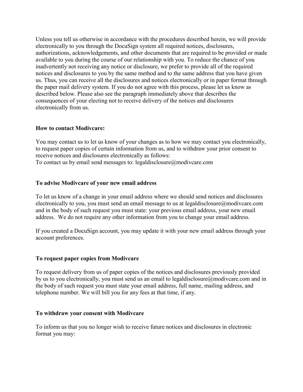 Unless you tell us otherwise in accordance with the procedures described herein, we will provide electronically to you through the DocuSign system all required notices, disclosures, authorizations, acknowledgements, and other documents that are required to be provided or made available to you during the course of our relationship with you. To reduce the chance of you inadvertently not receiving any notice or disclosure, we prefer to provide all of the required notices and disclosures to you by the same method and to the same address that you have given us. Thus, you can receive all the disclosures and notices electronically or in paper format through the paper mail delivery system. If you do not agree with this process, please let us know as described below. Please also see the paragraph immediately above that describes the consequences of your electing not to receive delivery of the notices and disclosures electronically from us. How to contact Modivcare: You may contact us to let us know of your changes as to how we may contact you electronically, to request paper copies of certain information from us, and to withdraw your prior consent to receive notices and disclosures electronically as follows: To contact us by email send messages to: legaldisclosure@modivcare.com To advise Modivcare of your new email address To let us know of a change in your email address where we should send notices and disclosures electronically to you, you must send an email message to us at legaldisclosure@modivcare.com and in the body of such request you must state: your previous email address, your new email address. We do not require any other information from you to change your email address. If you created a DocuSign account, you may update it with your new email address through your account preferences. To request paper copies from Modivcare To request delivery from us of paper copies of the notices and disclosures previously provided by us to you electronically, you must send us an email to legaldisclosure@modivcare.com and in the body of such request you must state your email address, full name, mailing address, and telephone number. We will bill you for any fees at that time, if any. To withdraw your consent with Modivcare To inform us that you no longer wish to receive future notices and disclosures in electronic format you may: