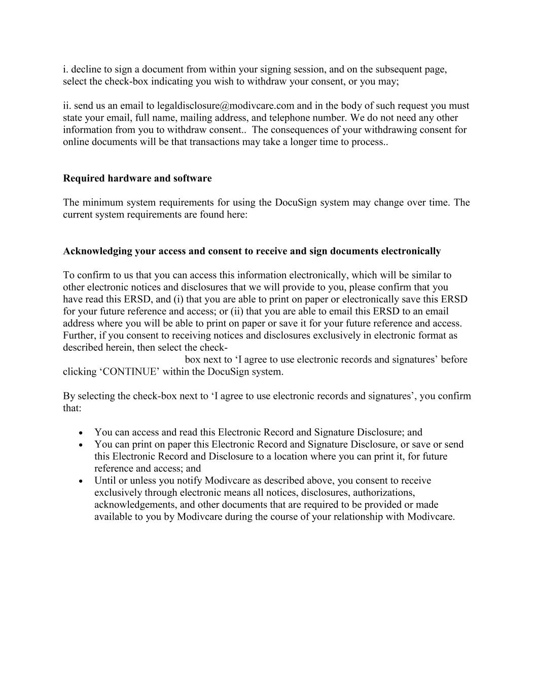 i. decline to sign a document from within your signing session, and on the subsequent page, select the check-box indicating you wish to withdraw your consent, or you may; ii. send us an email to legaldisclosure@modivcare.com and in the body of such request you must state your email, full name, mailing address, and telephone number. We do not need any other information from you to withdraw consent.. The consequences of your withdrawing consent for online documents will be that transactions may take a longer time to process.. Required hardware and software The minimum system requirements for using the DocuSign system may change over time. The current system requirements are found here: Acknowledging your access and consent to receive and sign documents electronically To confirm to us that you can access this information electronically, which will be similar to other electronic notices and disclosures that we will provide to you, please confirm that you have read this ERSD, and (i) that you are able to print on paper or electronically save this ERSD for your future reference and access; or (ii) that you are able to email this ERSD to an email address where you will be able to print on paper or save it for your future reference and access. Further, if you consent to receiving notices and disclosures exclusively in electronic format as described herein, then select the check- By selecting the check- that: You can access and read this Electronic Record and Signature Disclosure; and You can print on paper this Electronic Record and Signature Disclosure, or save or send this Electronic Record and Disclosure to a location where you can print it, for future reference and access; and Until or unless you notify Modivcare as described above, you consent to receive exclusively through electronic means all notices, disclosures, authorizations, acknowledgements, and other documents that are required to be provided or made available to you by Modivcare during the course of your relationship with Modivcare.