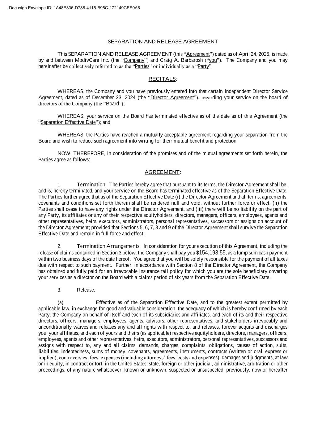 SEPARATION AND RELEASE AGREEMENT This SEPARATION AND RELEASE AGREEMENT (this “Agreement”) dated as of April 24, 2025, is made by and between ModivCare Inc. (the “Company”) and Craig A. Barbarosh (“you”). The Company and you may hereinafter be collectively referred to as the “Parties” or individually as a “Party”. RECITALS: WHEREAS, the Company and you have previously entered into that certain Independent Director Service Agreement, dated as of December 23, 2024 (the “Director Agreement”), regarding your service on the board of directors of the Company (the “Board”); WHEREAS, your service on the Board has terminated effective as of the date as of this Agreement (the “Separation Effective Date”); and WHEREAS, the Parties have reached a mutually acceptable agreement regarding your separation from the Board and wish to reduce such agreement into writing for their mutual benefit and protection. NOW, THEREFORE, in consideration of the promises and of the mutual agreements set forth herein, the Parties agree as follows: AGREEMENT: 1. Termination. The Parties hereby agree that pursuant to its terms, the Director Agreement shall be, and is, hereby terminated, and your service on the Board has terminated effective as of the Separation Effective Date. The Parties further agree that as of the Separation Effective Date (i) the Director Agreement and all terms, agreements, covenants and conditions set forth therein shall be rendered null and void, without further force or effect, (ii) the Parties shall cease to have any rights under the Director Agreement, and (iii) there will be no liability on the part of any Party, its affiliates or any of their respective equityholders, directors, managers, officers, employees, agents and other representatives, heirs, executors, administrators, personal representatives, successors or assigns on account of the Director Agreement; provided that Sections 5, 6, 7, 8 and 9 of the Director Agreement shall survive the Separation Effective Date and remain in full force and effect. 2. Termination Arrangements. In consideration for your execution of this Agreement, including the release of claims contained in Section 3 below, the Company shall pay you $154,193.55, as a lump sum cash payment within two business days of the date hereof. You agree that you will be solely responsible for the payment of all taxes due with respect to such payment. Further, in accordance with Section 8 of the Director Agreement, the Company has obtained and fully paid for an irrevocable insurance tail policy for which you are the sole beneficiary covering your services as a director on the Board with a claims period of six years from the Separation Effective Date. 3. Release. (a) Effective as of the Separation Effective Date, and to the greatest extent permitted by applicable law, in exchange for good and valuable consideration, the adequacy of which is hereby confirmed by each Party, the Company on behalf of itself and each of its subsidiaries and affiliates, and each of its and their respective directors, officers, managers, employees, agents, advisors, other representatives, and stakeholders irrevocably and unconditionally waives and releases any and all rights with respect to, and releases, forever acquits and discharges you, your affiliates, and each of yours and theirs (as applicable) respective equityholders, directors, managers, officers, employees, agents and other representatives, heirs, executors, administrators, personal representatives, successors and assigns with respect to, any and all claims, demands, charges, complaints, obligations, causes of action, suits, liabilities, indebtedness, sums of money, covenants, agreements, instruments, contracts (written or oral, express or implied), controversies, fees, expenses (including attorneys’ fees, costs and expenses), damages and judgments, at law or in equity, in contract or tort, in the United States, state, foreign or other judicial, administrative, arbitration or other proceedings, of any nature whatsoever, known or unknown, suspected or unsuspected, previously, now or hereafter Docusign Envelope ID: 1A48E336-D786-4115-B95C-172149CEE9A6