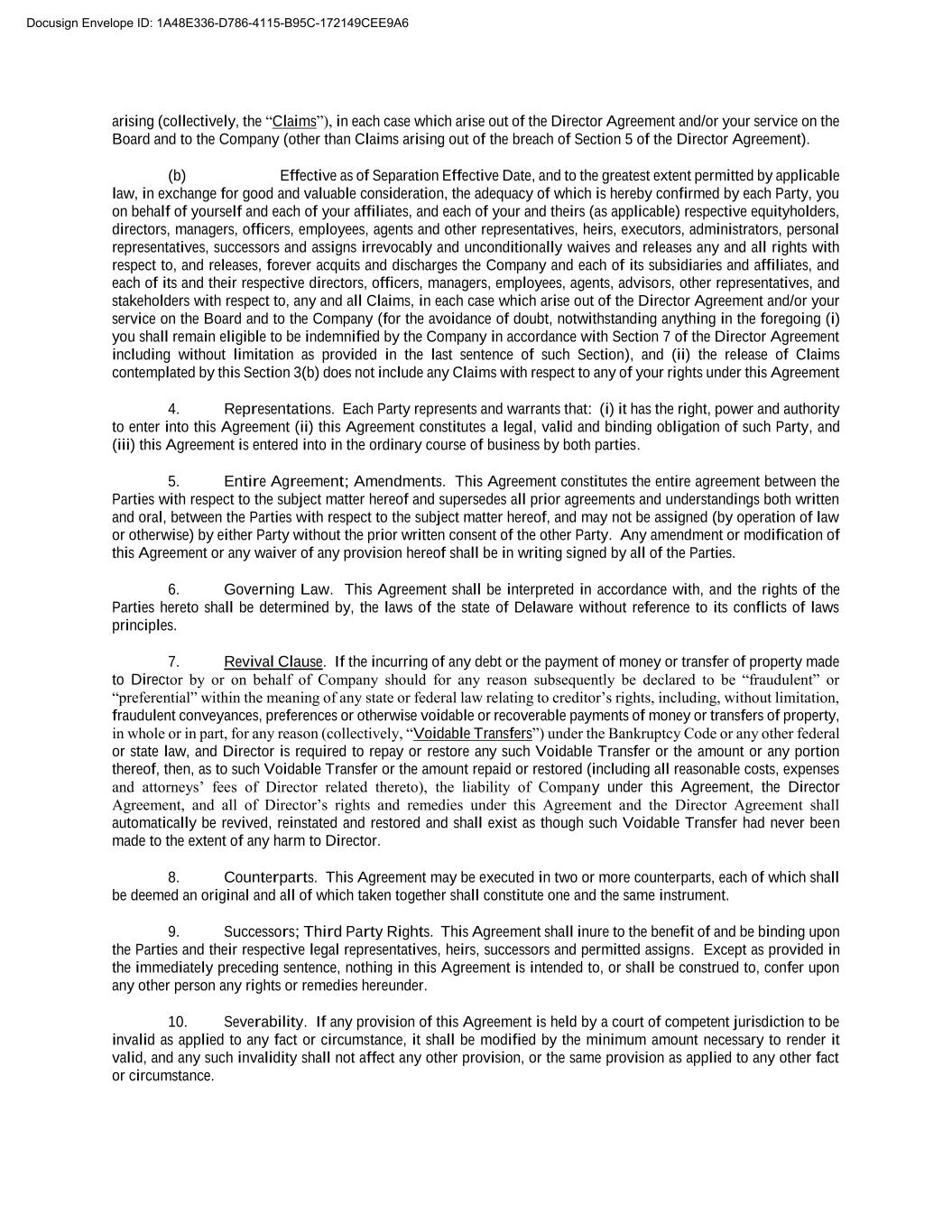 arising (collectively, the “Claims”), in each case which arise out of the Director Agreement and/or your service on the Board and to the Company (other than Claims arising out of the breach of Section 5 of the Director Agreement). (b) Effective as of Separation Effective Date, and to the greatest extent permitted by applicable law, in exchange for good and valuable consideration, the adequacy of which is hereby confirmed by each Party, you on behalf of yourself and each of your affiliates, and each of your and theirs (as applicable) respective equityholders, directors, managers, officers, employees, agents and other representatives, heirs, executors, administrators, personal representatives, successors and assigns irrevocably and unconditionally waives and releases any and all rights with respect to, and releases, forever acquits and discharges the Company and each of its subsidiaries and affiliates, and each of its and their respective directors, officers, managers, employees, agents, advisors, other representatives, and stakeholders with respect to, any and all Claims, in each case which arise out of the Director Agreement and/or your service on the Board and to the Company (for the avoidance of doubt, notwithstanding anything in the foregoing (i) you shall remain eligible to be indemnified by the Company in accordance with Section 7 of the Director Agreement including without limitation as provided in the last sentence of such Section), and (ii) the release of Claims contemplated by this Section 3(b) does not include any Claims with respect to any of your rights under this Agreement 4. Representations. Each Party represents and warrants that: (i) it has the right, power and authority to enter into this Agreement (ii) this Agreement constitutes a legal, valid and binding obligation of such Party, and (iii) this Agreement is entered into in the ordinary course of business by both parties. 5. Entire Agreement; Amendments. This Agreement constitutes the entire agreement between the Parties with respect to the subject matter hereof and supersedes all prior agreements and understandings both written and oral, between the Parties with respect to the subject matter hereof, and may not be assigned (by operation of law or otherwise) by either Party without the prior written consent of the other Party. Any amendment or modification of this Agreement or any waiver of any provision hereof shall be in writing signed by all of the Parties. 6. Governing Law. This Agreement shall be interpreted in accordance with, and the rights of the Parties hereto shall be determined by, the laws of the state of Delaware without reference to its conflicts of laws principles. 7. Revival Clause. If the incurring of any debt or the payment of money or transfer of property made to Director by or on behalf of Company should for any reason subsequently be declared to be “fraudulent” or “preferential” within the meaning of any state or federal law relating to creditor’s rights, including, without limitation, fraudulent conveyances, preferences or otherwise voidable or recoverable payments of money or transfers of property, in whole or in part, for any reason (collectively, “Voidable Transfers”) under the Bankruptcy Code or any other federal or state law, and Director is required to repay or restore any such Voidable Transfer or the amount or any portion thereof, then, as to such Voidable Transfer or the amount repaid or restored (including all reasonable costs, expenses and attorneys’ fees of Director related thereto), the liability of Company under this Agreement, the Director Agreement, and all of Director’s rights and remedies under this Agreement and the Director Agreement shall automatically be revived, reinstated and restored and shall exist as though such Voidable Transfer had never been made to the extent of any harm to Director. 8. Counterparts. This Agreement may be executed in two or more counterparts, each of which shall be deemed an original and all of which taken together shall constitute one and the same instrument. 9. Successors; Third Party Rights. This Agreement shall inure to the benefit of and be binding upon the Parties and their respective legal representatives, heirs, successors and permitted assigns. Except as provided in the immediately preceding sentence, nothing in this Agreement is intended to, or shall be construed to, confer upon any other person any rights or remedies hereunder. 10. Severability. If any provision of this Agreement is held by a court of competent jurisdiction to be invalid as applied to any fact or circumstance, it shall be modified by the minimum amount necessary to render it valid, and any such invalidity shall not affect any other provision, or the same provision as applied to any other fact or circumstance. Docusign Envelope ID: 1A48E336-D786-4115-B95C-172149CEE9A6