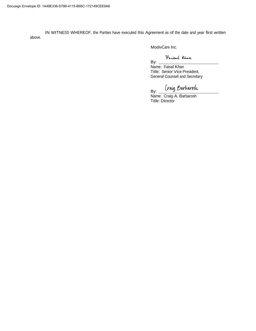 IN WITNESS WHEREOF, the Parties have executed this Agreement as of the date and year first written above. ModivCare Inc. By: Name: Faisal Khan Title: Senior Vice President, General Counsel and Secretary By: Name: Craig A. Barbarosh Title: Director Docusign Envelope ID: 1A48E336-D786-4115-B95C-172149CEE9A6