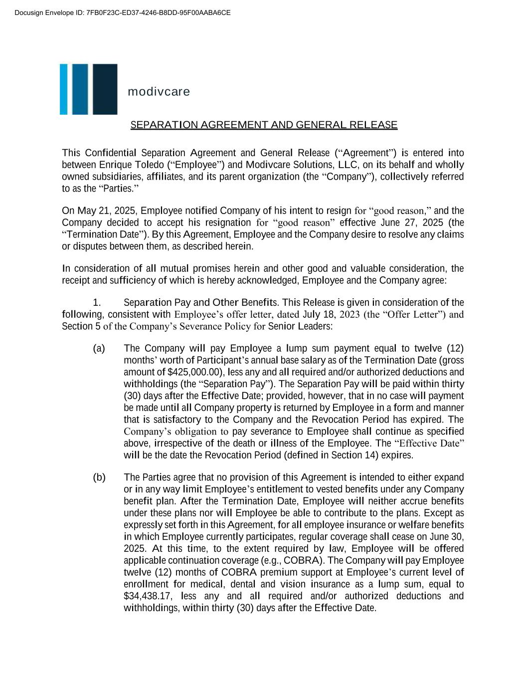 modivcare SEPARATION AGREEMENT AND GENERAL RELEASE This Confidential Separation Agreement and General Release (“Agreement”) is entered into between Enrique Toledo (“Employee”) and Modivcare Solutions, LLC, on its behalf and wholly owned subsidiaries, affiliates, and its parent organization (the “Company”), collectively referred to as the “Parties.” On May 21, 2025, Employee notified Company of his intent to resign for “good reason,” and the Company decided to accept his resignation for “good reason” effective June 27, 2025 (the “Termination Date”). By this Agreement, Employee and the Company desire to resolve any claims or disputes between them, as described herein. In consideration of all mutual promises herein and other good and valuable consideration, the receipt and sufficiency of which is hereby acknowledged, Employee and the Company agree: 1. Separation Pay and Other Benefits. This Release is given in consideration of the following, consistent with Employee’s offer letter, dated July 18, 2023 (the “Offer Letter”) and Section 5 of the Company’s Severance Policy for Senior Leaders: (a) The Company will pay Employee a lump sum payment equal to twelve (12) months’ worth of Participant’s annual base salary as of the Termination Date (gross amount of $425,000.00), less any and all required and/or authorized deductions and withholdings (the “Separation Pay”). The Separation Pay will be paid within thirty (30) days after the Effective Date; provided, however, that in no case will payment be made until all Company property is returned by Employee in a form and manner that is satisfactory to the Company and the Revocation Period has expired. The Company’s obligation to pay severance to Employee shall continue as specified above, irrespective of the death or illness of the Employee. The “Effective Date” will be the date the Revocation Period (defined in Section 14) expires. (b) The Parties agree that no provision of this Agreement is intended to either expand or in any way limit Employee’s entitlement to vested benefits under any Company benefit plan. After the Termination Date, Employee will neither accrue benefits under these plans nor will Employee be able to contribute to the plans. Except as expressly set forth in this Agreement, for all employee insurance or welfare benefits in which Employee currently participates, regular coverage shall cease on June 30, 2025. At this time, to the extent required by law, Employee will be offered applicable continuation coverage (e.g., COBRA). The Company will pay Employee twelve (12) months of COBRA premium support at Employee’s current level of enrollment for medical, dental and vision insurance as a lump sum, equal to $34,438.17, less any and all required and/or authorized deductions and withholdings, within thirty (30) days after the Effective Date. Docusign Envelope ID: 7FB0F23C-ED37-4246-B8DD-95F00AABA6CE