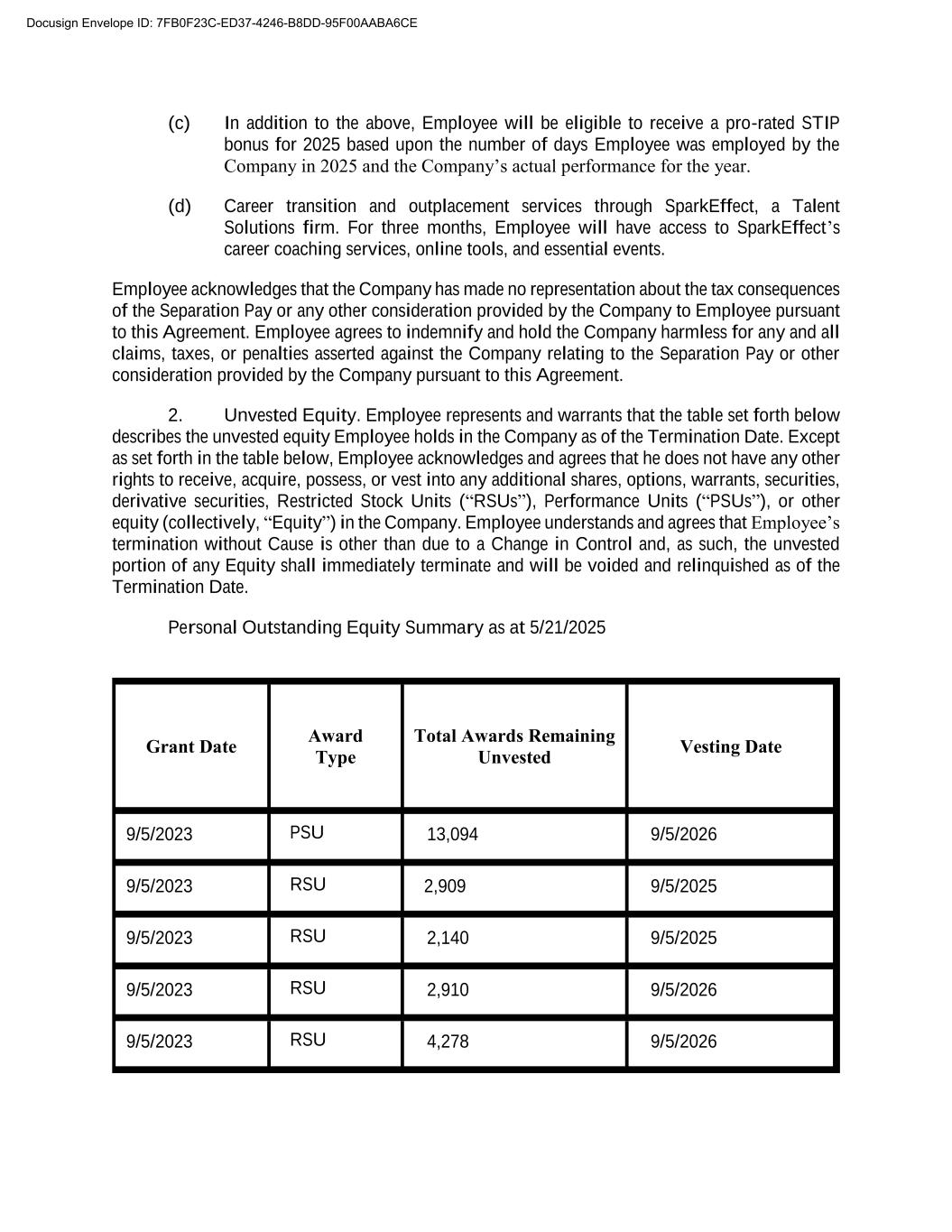 (c) In addition to the above, Employee will be eligible to receive a pro-rated STIP bonus for 2025 based upon the number of days Employee was employed by the Company in 2025 and the Company’s actual performance for the year. (d) Career transition and outplacement services through SparkEffect, a Talent Solutions firm. For three months, Employee will have access to SparkEffect’s career coaching services, online tools, and essential events. Employee acknowledges that the Company has made no representation about the tax consequences of the Separation Pay or any other consideration provided by the Company to Employee pursuant to this Agreement. Employee agrees to indemnify and hold the Company harmless for any and all claims, taxes, or penalties asserted against the Company relating to the Separation Pay or other consideration provided by the Company pursuant to this Agreement. 2. Unvested Equity. Employee represents and warrants that the table set forth below describes the unvested equity Employee holds in the Company as of the Termination Date. Except as set forth in the table below, Employee acknowledges and agrees that he does not have any other rights to receive, acquire, possess, or vest into any additional shares, options, warrants, securities, derivative securities, Restricted Stock Units (“RSUs”), Performance Units (“PSUs”), or other equity (collectively, “Equity”) in the Company. Employee understands and agrees that Employee’s termination without Cause is other than due to a Change in Control and, as such, the unvested portion of any Equity shall immediately terminate and will be voided and relinquished as of the Termination Date. Personal Outstanding Equity Summary as at 5/21/2025 Grant Date Award Type Total Awards Remaining Unvested Vesting Date 9/5/2023 PSU 13,094 9/5/2026 9/5/2023 RSU 2,909 9/5/2025 9/5/2023 RSU 2,140 9/5/2025 9/5/2023 RSU 2,910 9/5/2026 9/5/2023 RSU 4,278 9/5/2026 Docusign Envelope ID: 7FB0F23C-ED37-4246-B8DD-95F00AABA6CE