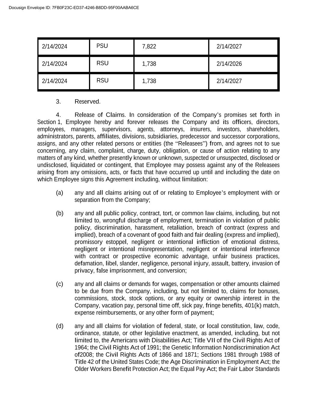 2/14/2024 PSU 7,822 2/14/2027 2/14/2024 RSU 1,738 2/14/2026 2/14/2024 RSU 1,738 2/14/2027 3. Reserved. 4. Release of Claims. In consideration of the Company’s promises set forth in Section 1, Employee hereby and forever releases the Company and its officers, directors, employees, managers, supervisors, agents, attorneys, insurers, investors, shareholders, administrators, parents, affiliates, divisions, subsidiaries, predecessor and successor corporations, assigns, and any other related persons or entities (the “Releasees”) from, and agrees not to sue concerning, any claim, complaint, charge, duty, obligation, or cause of action relating to any matters of any kind, whether presently known or unknown, suspected or unsuspected, disclosed or undisclosed, liquidated or contingent, that Employee may possess against any of the Releasees arising from any omissions, acts, or facts that have occurred up until and including the date on which Employee signs this Agreement including, without limitation: (a) any and all claims arising out of or relating to Employee’s employment with or separation from the Company; (b) any and all public policy, contract, tort, or common law claims, including, but not limited to, wrongful discharge of employment, termination in violation of public policy, discrimination, harassment, retaliation, breach of contract (express and implied), breach of a covenant of good faith and fair dealing (express and implied), promissory estoppel, negligent or intentional infliction of emotional distress, negligent or intentional misrepresentation, negligent or intentional interference with contract or prospective economic advantage, unfair business practices, defamation, libel, slander, negligence, personal injury, assault, battery, invasion of privacy, false imprisonment, and conversion; (c) any and all claims or demands for wages, compensation or other amounts claimed to be due from the Company, including, but not limited to, claims for bonuses, commissions, stock, stock options, or any equity or ownership interest in the Company, vacation pay, personal time off, sick pay, fringe benefits, 401(k) match, expense reimbursements, or any other form of payment; (d) any and all claims for violation of federal, state, or local constitution, law, code, ordinance, statute, or other legislative enactment, as amended, including, but not limited to, the Americans with Disabilities Act; Title VII of the Civil Rights Act of 1964; the Civil Rights Act of 1991; the Genetic Information Nondiscrimination Act of2008; the Civil Rights Acts of 1866 and 1871; Sections 1981 through 1988 of Title 42 of the United States Code; the Age Discrimination in Employment Act; the Older Workers Benefit Protection Act; the Equal Pay Act; the Fair Labor Standards Docusign Envelope ID: 7FB0F23C-ED37-4246-B8DD-95F00AABA6CE