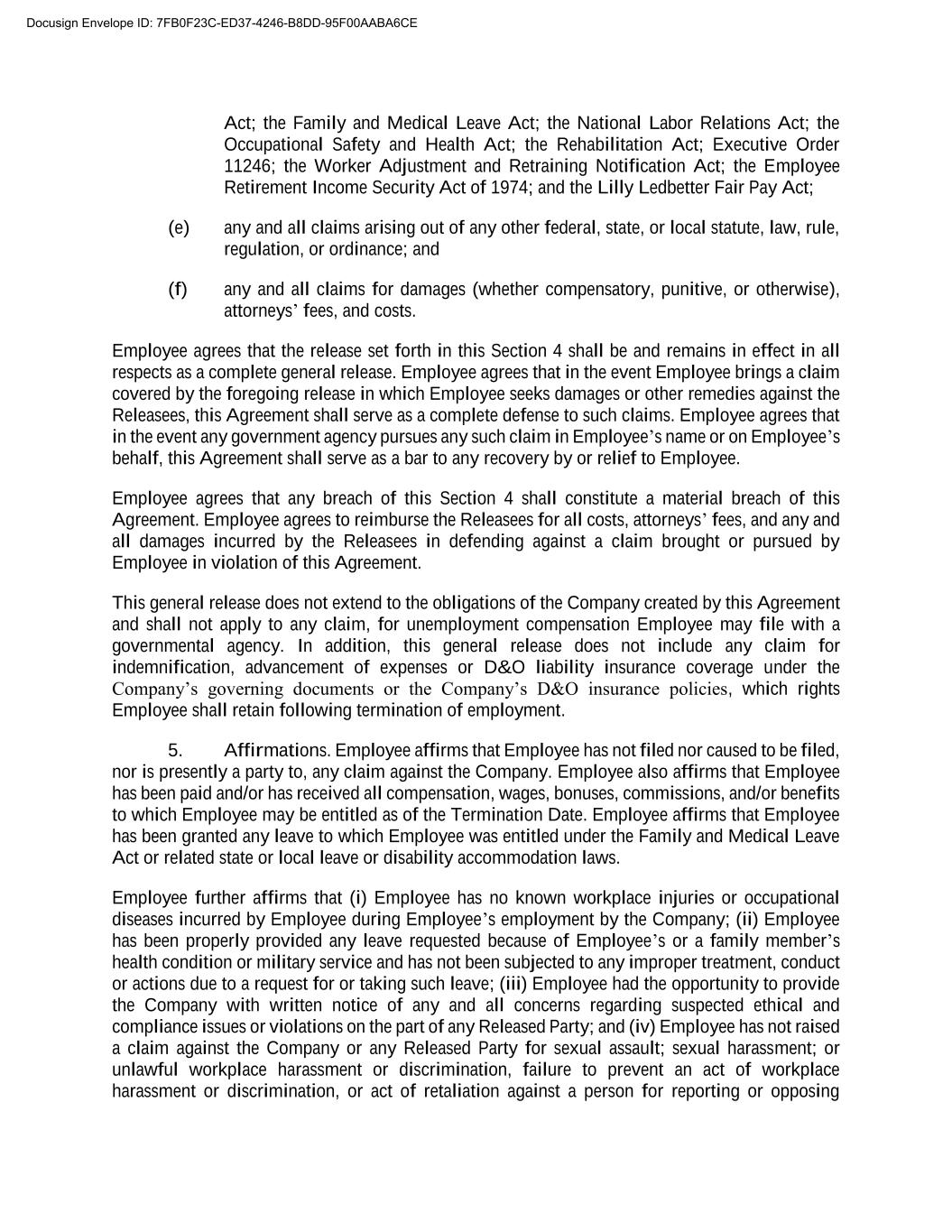 Act; the Family and Medical Leave Act; the National Labor Relations Act; the Occupational Safety and Health Act; the Rehabilitation Act; Executive Order 11246; the Worker Adjustment and Retraining Notification Act; the Employee Retirement Income Security Act of 1974; and the Lilly Ledbetter Fair Pay Act; (e) any and all claims arising out of any other federal, state, or local statute, law, rule, regulation, or ordinance; and (f) any and all claims for damages (whether compensatory, punitive, or otherwise), attorneys’ fees, and costs. Employee agrees that the release set forth in this Section 4 shall be and remains in effect in all respects as a complete general release. Employee agrees that in the event Employee brings a claim covered by the foregoing release in which Employee seeks damages or other remedies against the Releasees, this Agreement shall serve as a complete defense to such claims. Employee agrees that in the event any government agency pursues any such claim in Employee’s name or on Employee’s behalf, this Agreement shall serve as a bar to any recovery by or relief to Employee. Employee agrees that any breach of this Section 4 shall constitute a material breach of this Agreement. Employee agrees to reimburse the Releasees for all costs, attorneys’ fees, and any and all damages incurred by the Releasees in defending against a claim brought or pursued by Employee in violation of this Agreement. This general release does not extend to the obligations of the Company created by this Agreement and shall not apply to any claim, for unemployment compensation Employee may file with a governmental agency. In addition, this general release does not include any claim for indemnification, advancement of expenses or D&O liability insurance coverage under the Company’s governing documents or the Company’s D&O insurance policies, which rights Employee shall retain following termination of employment. 5. Affirmations. Employee affirms that Employee has not filed nor caused to be filed, nor is presently a party to, any claim against the Company. Employee also affirms that Employee has been paid and/or has received all compensation, wages, bonuses, commissions, and/or benefits to which Employee may be entitled as of the Termination Date. Employee affirms that Employee has been granted any leave to which Employee was entitled under the Family and Medical Leave Act or related state or local leave or disability accommodation laws. Employee further affirms that (i) Employee has no known workplace injuries or occupational diseases incurred by Employee during Employee’s employment by the Company; (ii) Employee has been properly provided any leave requested because of Employee’s or a family member’s health condition or military service and has not been subjected to any improper treatment, conduct or actions due to a request for or taking such leave; (iii) Employee had the opportunity to provide the Company with written notice of any and all concerns regarding suspected ethical and compliance issues or violations on the part of any Released Party; and (iv) Employee has not raised a claim against the Company or any Released Party for sexual assault; sexual harassment; or unlawful workplace harassment or discrimination, failure to prevent an act of workplace harassment or discrimination, or act of retaliation against a person for reporting or opposing Docusign Envelope ID: 7FB0F23C-ED37-4246-B8DD-95F00AABA6CE