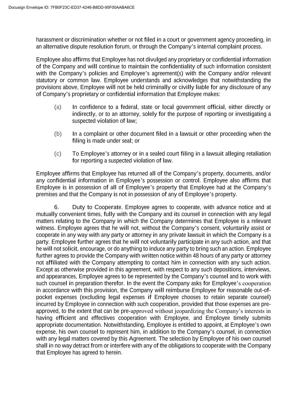 harassment or discrimination whether or not filed in a court or government agency proceeding, in an alternative dispute resolution forum, or through the Company’s internal complaint process. Employee also affirms that Employee has not divulged any proprietary or confidential information of the Company and will continue to maintain the confidentiality of such information consistent with the Company’s policies and Employee’s agreement(s) with the Company and/or relevant statutory or common law. Employee understands and acknowledges that notwithstanding the provisions above, Employee will not be held criminally or civilly liable for any disclosure of any of Company’s proprietary or confidential information that Employee makes: (a) In confidence to a federal, state or local government official, either directly or indirectly, or to an attorney, solely for the purpose of reporting or investigating a suspected violation of law; (b) In a complaint or other document filed in a lawsuit or other proceeding when the filing is made under seal; or (c) To Employee’s attorney or in a sealed court filing in a lawsuit alleging retaliation for reporting a suspected violation of law. Employee affirms that Employee has returned all of the Company’s property, documents, and/or any confidential information in Employee’s possession or control. Employee also affirms that Employee is in possession of all of Employee’s property that Employee had at the Company’s premises and that the Company is not in possession of any of Employee’s property. 6. Duty to Cooperate. Employee agrees to cooperate, with advance notice and at mutually convenient times, fully with the Company and its counsel in connection with any legal matters relating to the Company in which the Company determines that Employee is a relevant witness. Employee agrees that he will not, without the Company’s consent, voluntarily assist or cooperate in any way with any party or attorney in any private lawsuit in which the Company is a party. Employee further agrees that he will not voluntarily participate in any such action, and that he will not solicit, encourage, or do anything to induce any party to bring such an action. Employee further agrees to provide the Company with written notice within 48 hours of any party or attorney not affiliated with the Company attempting to contact him in connection with any such action. Except as otherwise provided in this agreement, with respect to any such depositions, interviews, and appearances, Employee agrees to be represented by the Company’s counsel and to work with such counsel in preparation therefor. In the event the Company asks for Employee’s cooperation in accordance with this provision, the Company will reimburse Employee for reasonable out-of- pocket expenses (excluding legal expenses if Employee chooses to retain separate counsel) incurred by Employee in connection with such cooperation, provided that those expenses are pre- approved, to the extent that can be pre-approved without jeopardizing the Company’s interests in having efficient and effectives cooperation with Employee, and Employee timely submits appropriate documentation. Notwithstanding, Employee is entitled to appoint, at Employee’s own expense, his own counsel to represent him, in addition to the Company’s counsel, in connection with any legal matters covered by this Agreement. The selection by Employee of his own counsel shall in no way detract from or interfere with any of the obligations to cooperate with the Company that Employee has agreed to herein. Docusign Envelope ID: 7FB0F23C-ED37-4246-B8DD-95F00AABA6CE