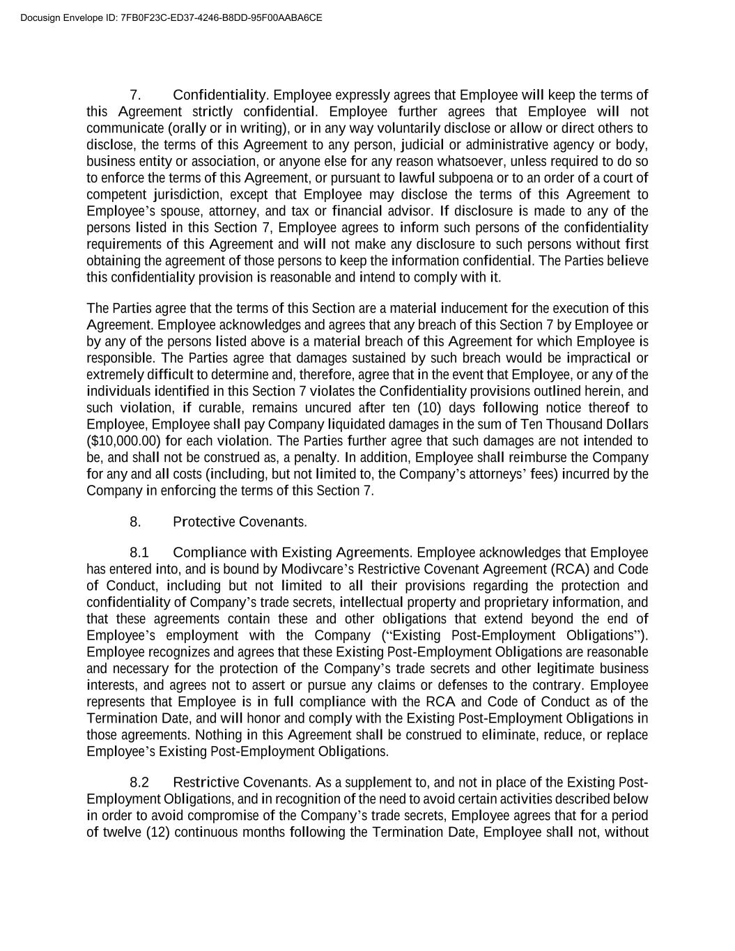 7. Confidentiality. Employee expressly agrees that Employee will keep the terms of this Agreement strictly confidential. Employee further agrees that Employee will not communicate (orally or in writing), or in any way voluntarily disclose or allow or direct others to disclose, the terms of this Agreement to any person, judicial or administrative agency or body, business entity or association, or anyone else for any reason whatsoever, unless required to do so to enforce the terms of this Agreement, or pursuant to lawful subpoena or to an order of a court of competent jurisdiction, except that Employee may disclose the terms of this Agreement to Employee’s spouse, attorney, and tax or financial advisor. If disclosure is made to any of the persons listed in this Section 7, Employee agrees to inform such persons of the confidentiality requirements of this Agreement and will not make any disclosure to such persons without first obtaining the agreement of those persons to keep the information confidential. The Parties believe this confidentiality provision is reasonable and intend to comply with it. The Parties agree that the terms of this Section are a material inducement for the execution of this Agreement. Employee acknowledges and agrees that any breach of this Section 7 by Employee or by any of the persons listed above is a material breach of this Agreement for which Employee is responsible. The Parties agree that damages sustained by such breach would be impractical or extremely difficult to determine and, therefore, agree that in the event that Employee, or any of the individuals identified in this Section 7 violates the Confidentiality provisions outlined herein, and such violation, if curable, remains uncured after ten (10) days following notice thereof to Employee, Employee shall pay Company liquidated damages in the sum of Ten Thousand Dollars ($10,000.00) for each violation. The Parties further agree that such damages are not intended to be, and shall not be construed as, a penalty. In addition, Employee shall reimburse the Company for any and all costs (including, but not limited to, the Company’s attorneys’ fees) incurred by the Company in enforcing the terms of this Section 7. 8. Protective Covenants. 8.1 Compliance with Existing Agreements. Employee acknowledges that Employee has entered into, and is bound by Modivcare’s Restrictive Covenant Agreement (RCA) and Code of Conduct, including but not limited to all their provisions regarding the protection and confidentiality of Company’s trade secrets, intellectual property and proprietary information, and that these agreements contain these and other obligations that extend beyond the end of Employee’s employment with the Company (“Existing Post-Employment Obligations”). Employee recognizes and agrees that these Existing Post-Employment Obligations are reasonable and necessary for the protection of the Company’s trade secrets and other legitimate business interests, and agrees not to assert or pursue any claims or defenses to the contrary. Employee represents that Employee is in full compliance with the RCA and Code of Conduct as of the Termination Date, and will honor and comply with the Existing Post-Employment Obligations in those agreements. Nothing in this Agreement shall be construed to eliminate, reduce, or replace Employee’s Existing Post-Employment Obligations. 8.2 Restrictive Covenants. As a supplement to, and not in place of the Existing Post­ Employment Obligations, and in recognition of the need to avoid certain activities described below in order to avoid compromise of the Company’s trade secrets, Employee agrees that for a period of twelve (12) continuous months following the Termination Date, Employee shall not, without Docusign Envelope ID: 7FB0F23C-ED37-4246-B8DD-95F00AABA6CE